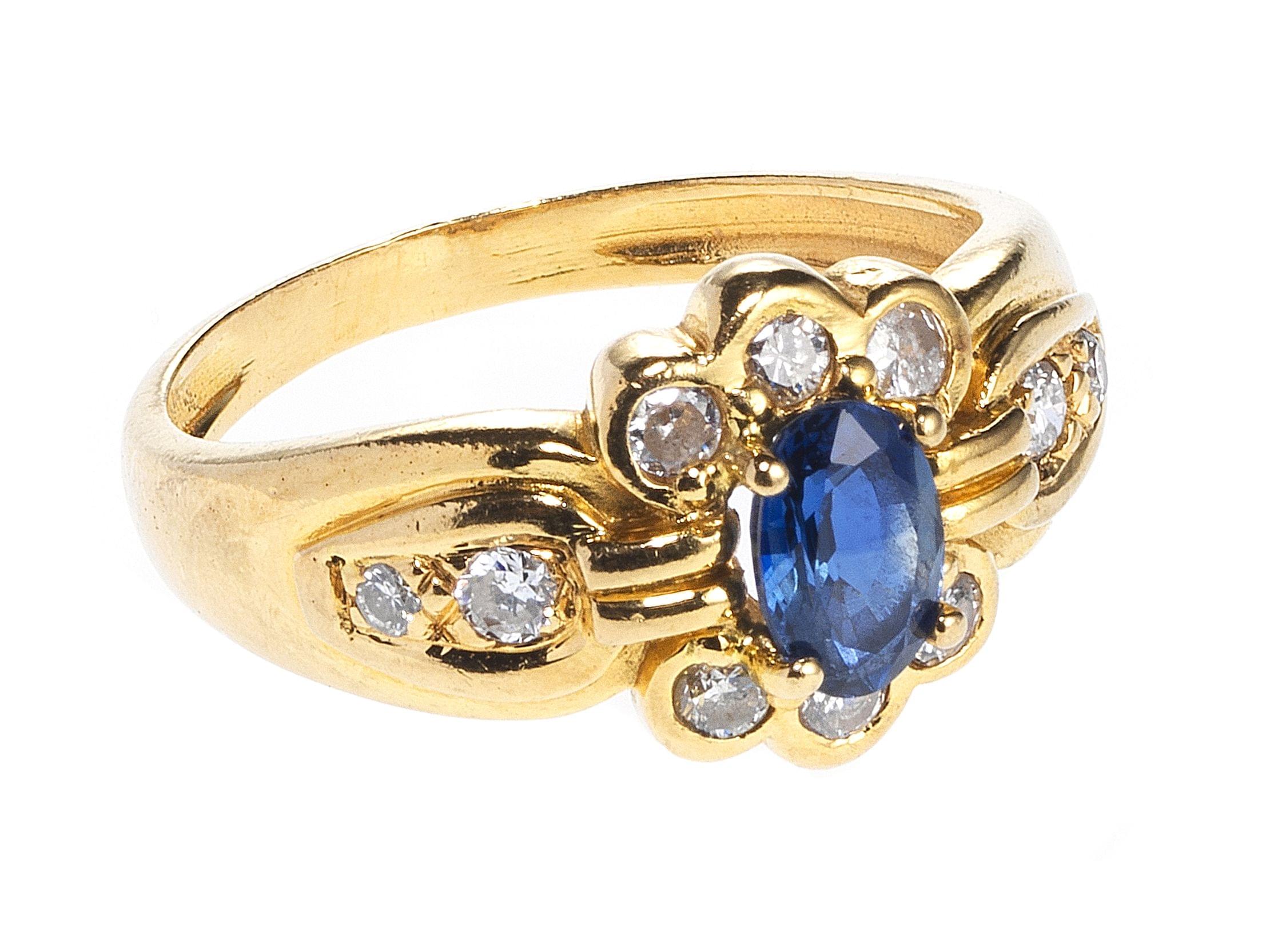 3130. Bague fleur sertie d'un saphir taille ovale (env. 0,5 ct) entouré et épaulé de diamants