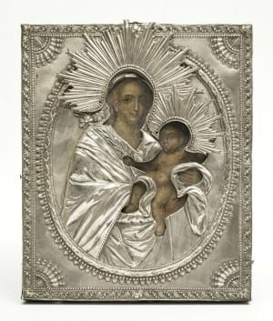 Icône sur panneau à oklade néoclassique en argent, 84 zolotniks,...