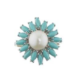 3170. Bague fleur sertie d'une perle entourée de turquoises de forme navette