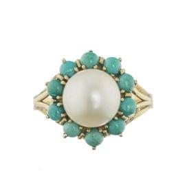 3172. Bague fleur sertie d'une perle entourée de turquoises