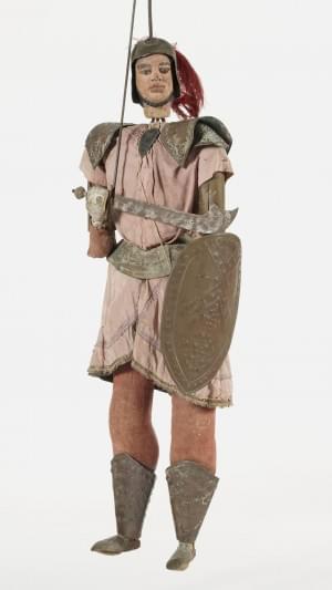 Bois sculpté, tissu et éléments en laiton, H de 130 à 140 cm