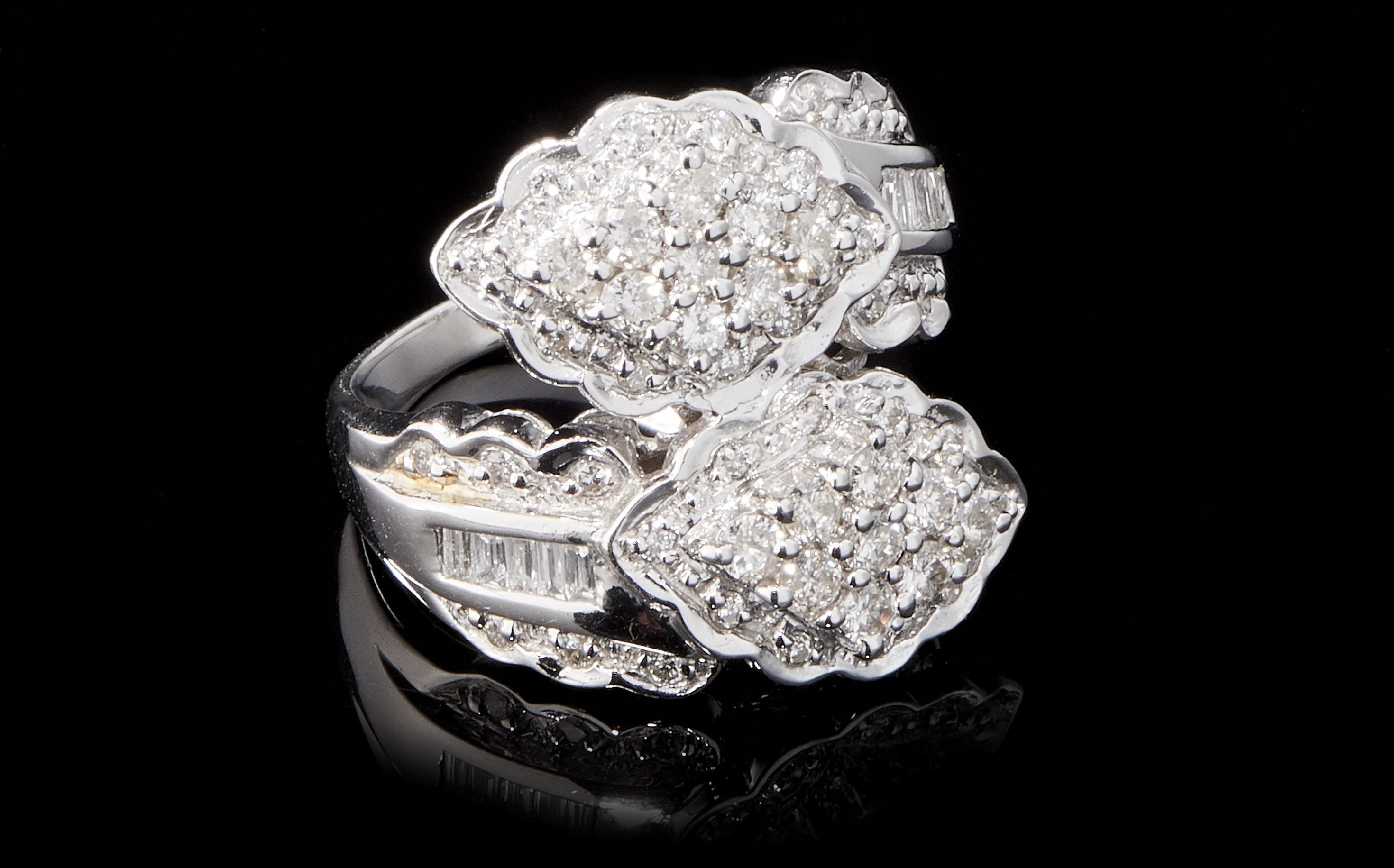 725. Bague formant un "toi et moi" pavé de diamants taille brillant et baguette