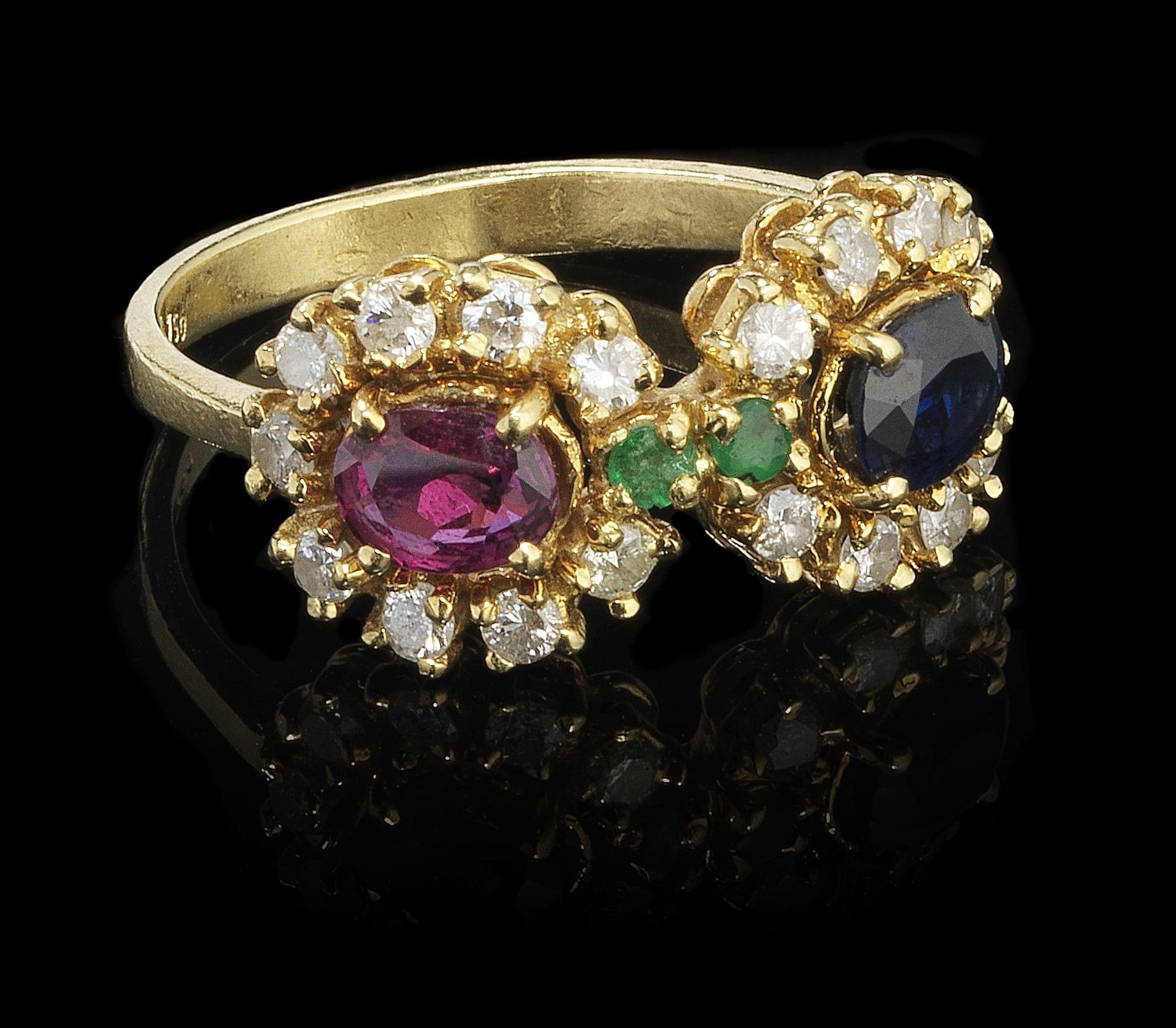 L'un centré d'un rubis taille ovale (env. 0,4 ct) entouré de diamants, l'autre serti d'un saphir taille ovale (env. 0,4 ct) entouré de diamants, réunis par deux petites émeraudes, or 750, doigt 51-11, 3 g. Pour les lots précédés d'un *, la TVA de 7,7% est due sur l'entier du prix d'adjudication.