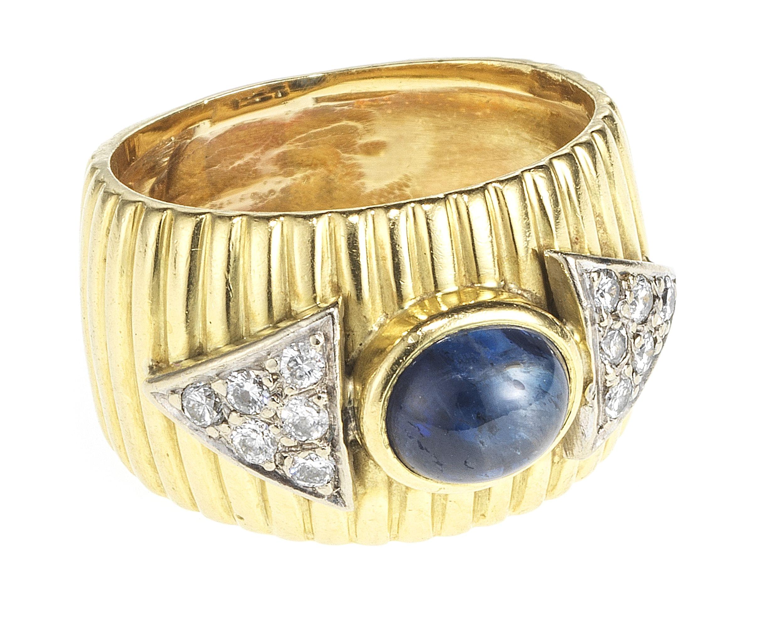 3311. Bague godronnée sertie d'un saphir taille cabochon (env. 1,5 ct) épaulé de deux triangles pavés de diamants