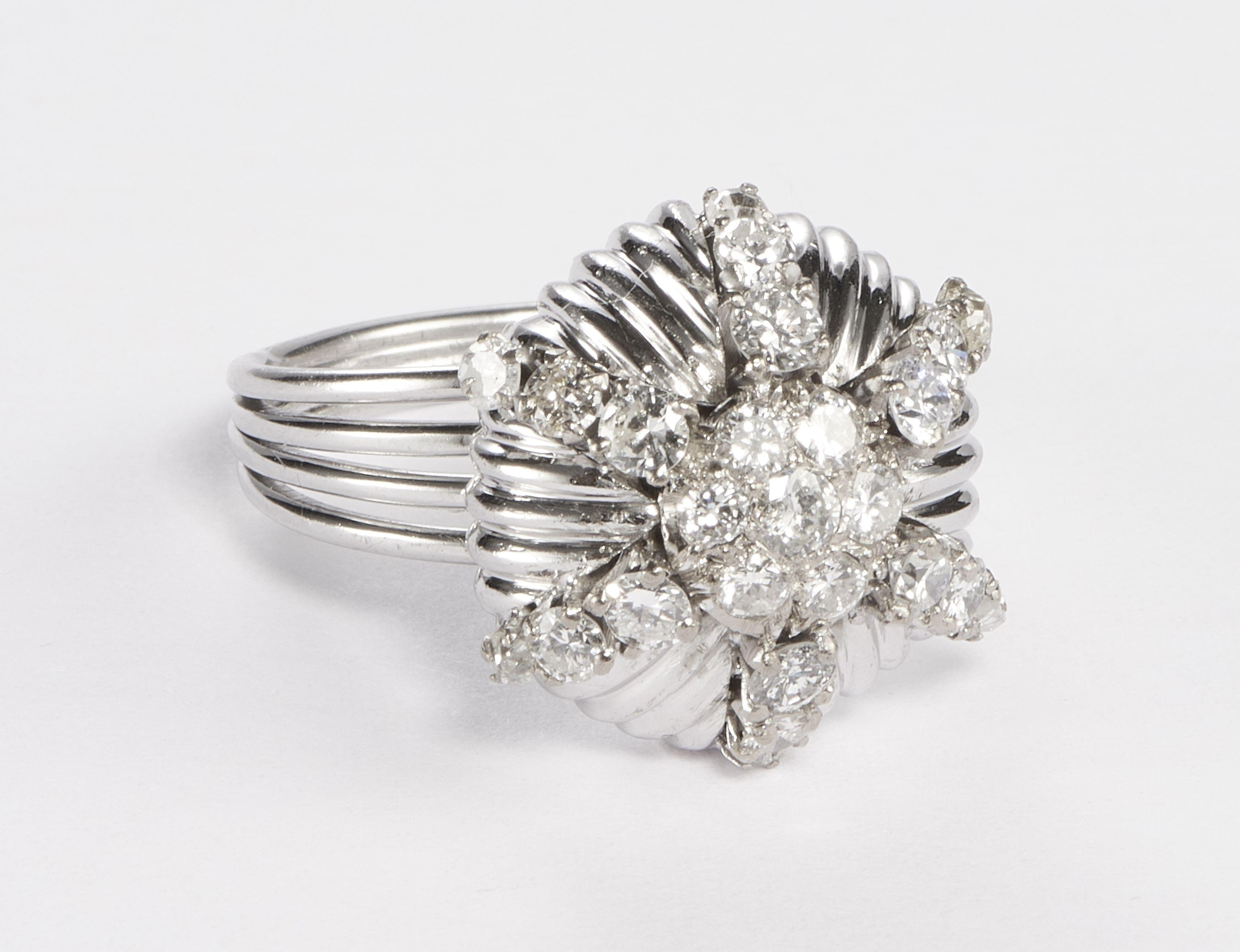 3226. Bague godronnée stylisée centrée d'un motif serti de diamants rehaussé de lignes de diamants