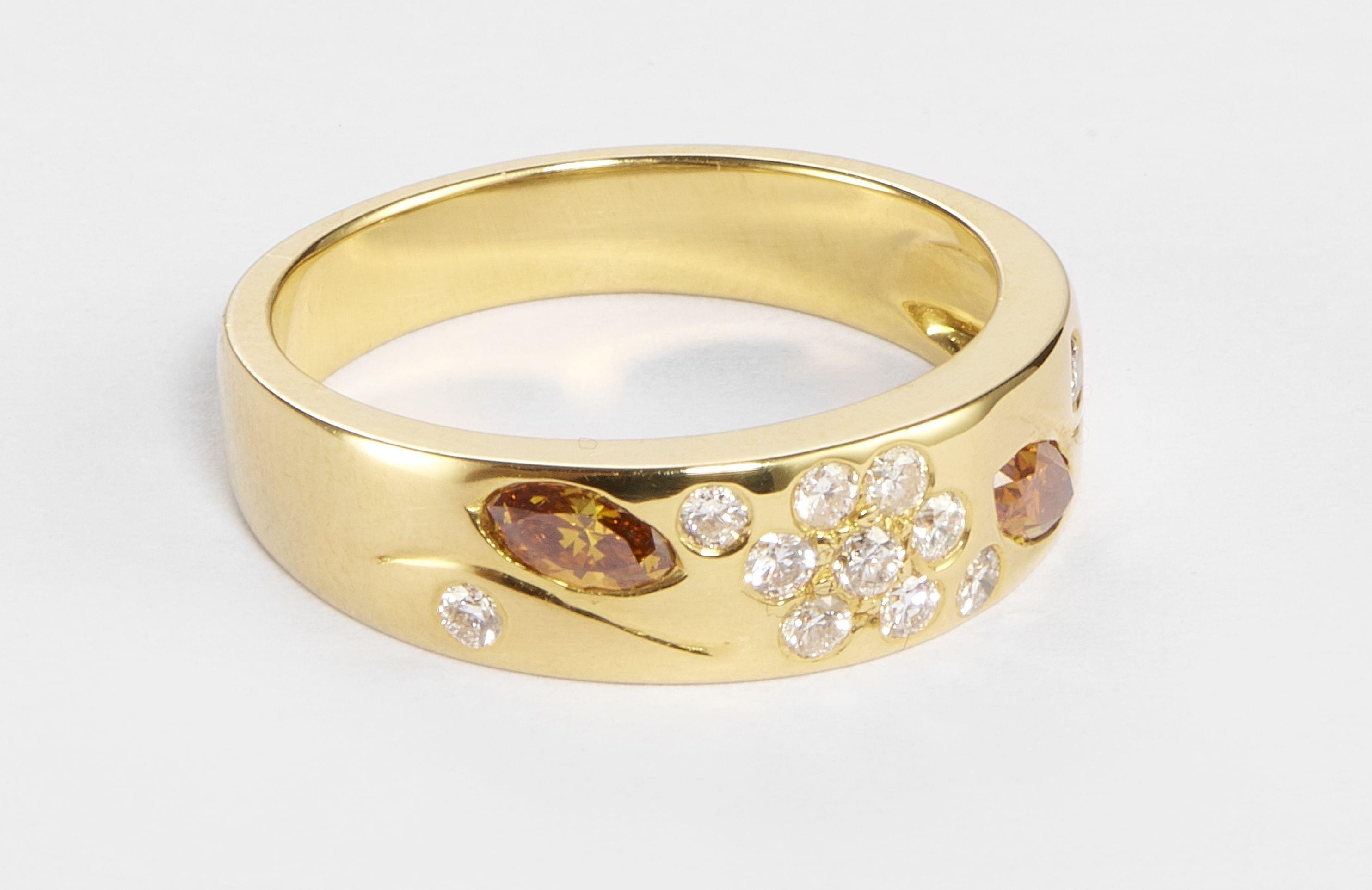 3188. Bague jonc pavé de diamants taille brillant et de diamants cognac taille marquise