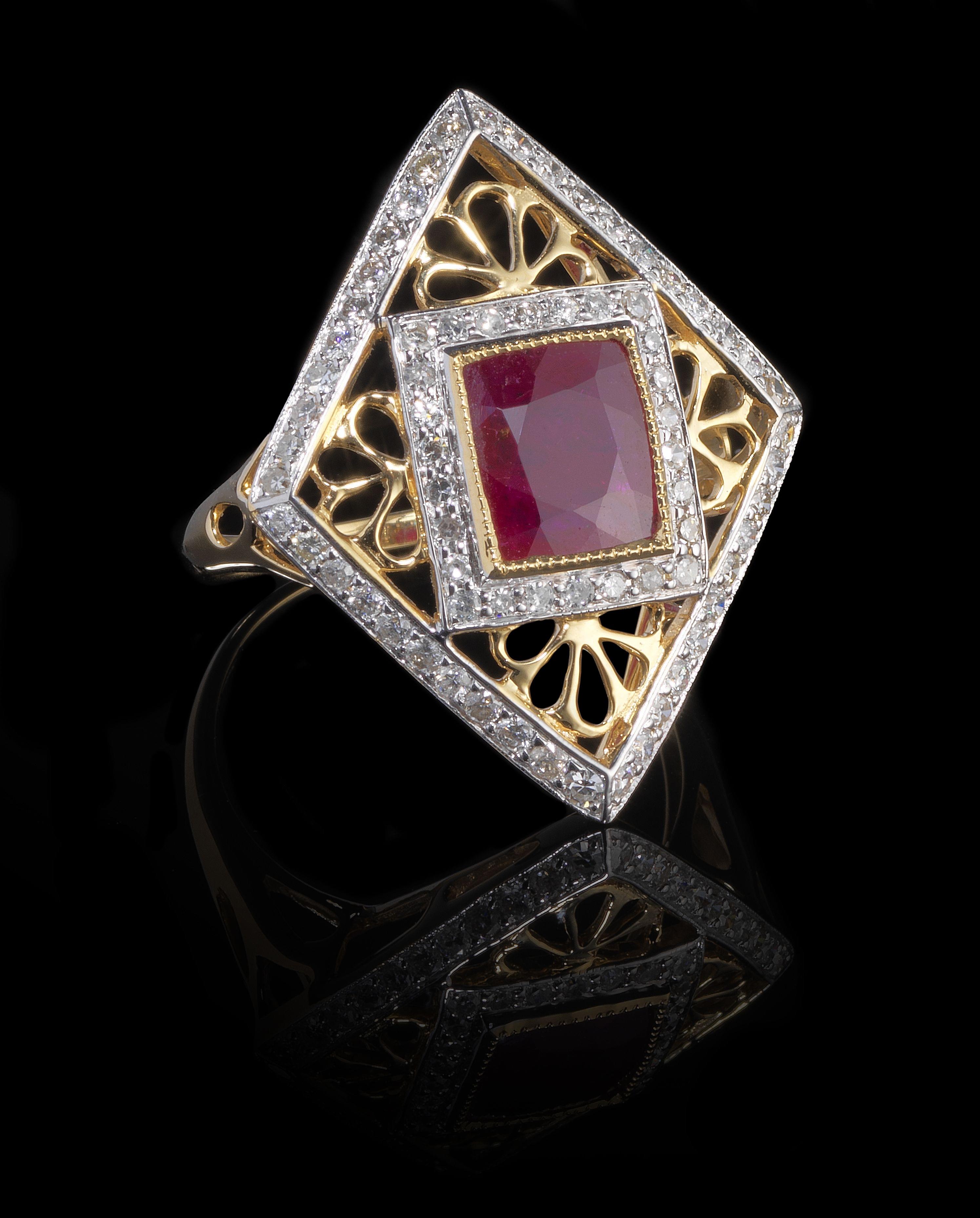 3505. *Bague losange ajourée sertie d'un rubis taille coussin rectangulaire (1,56 ct) entouré de diamants (0,67 ct)