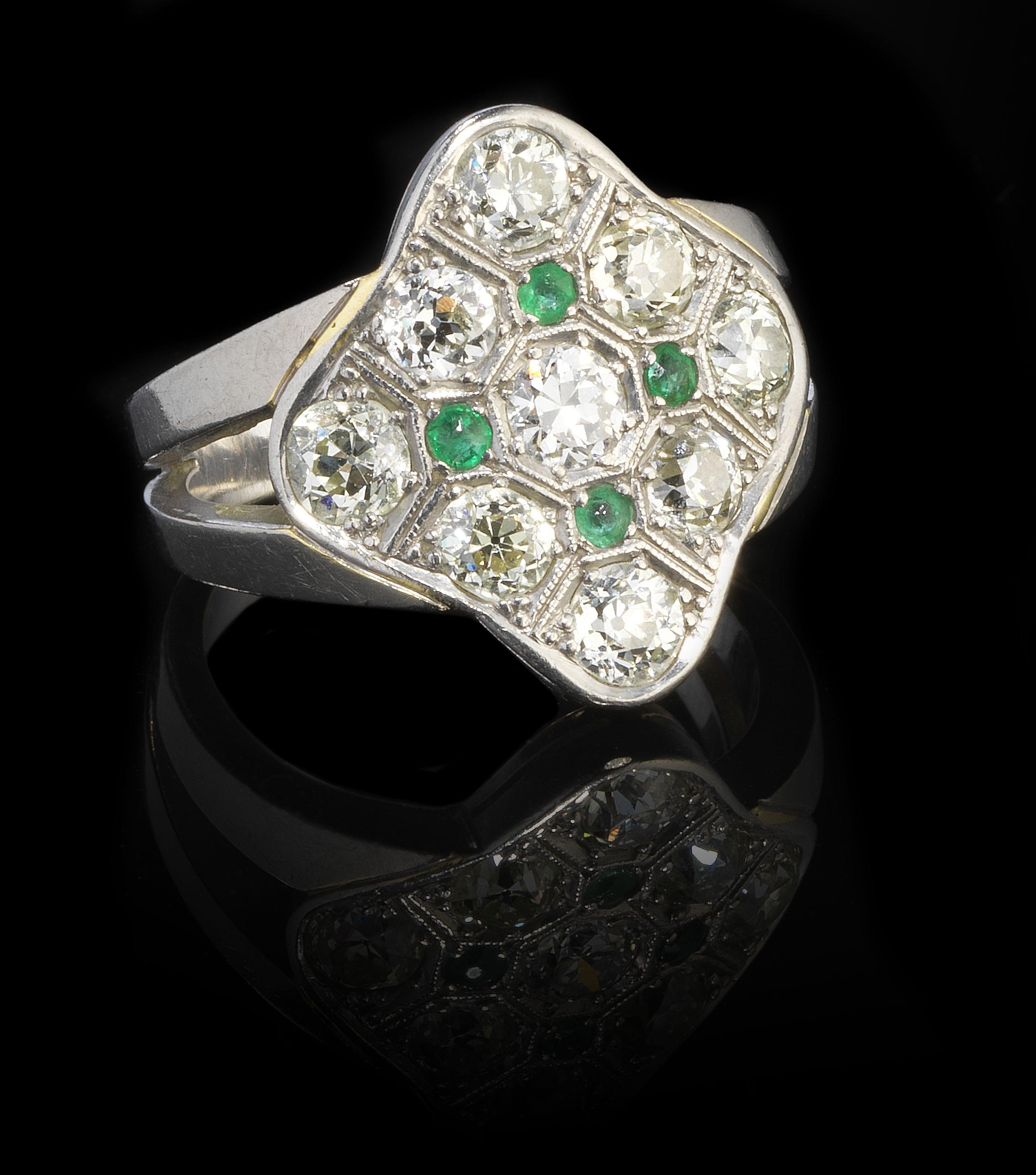 3449. Bague losange pavée de diamants taille ancienne (total env. 1,8 ct) rehaussés de quatre petites émeraudes