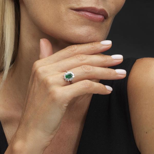 3409. Bague marguerite centrée d'une émeraude taille ovale (env. 1 ct)