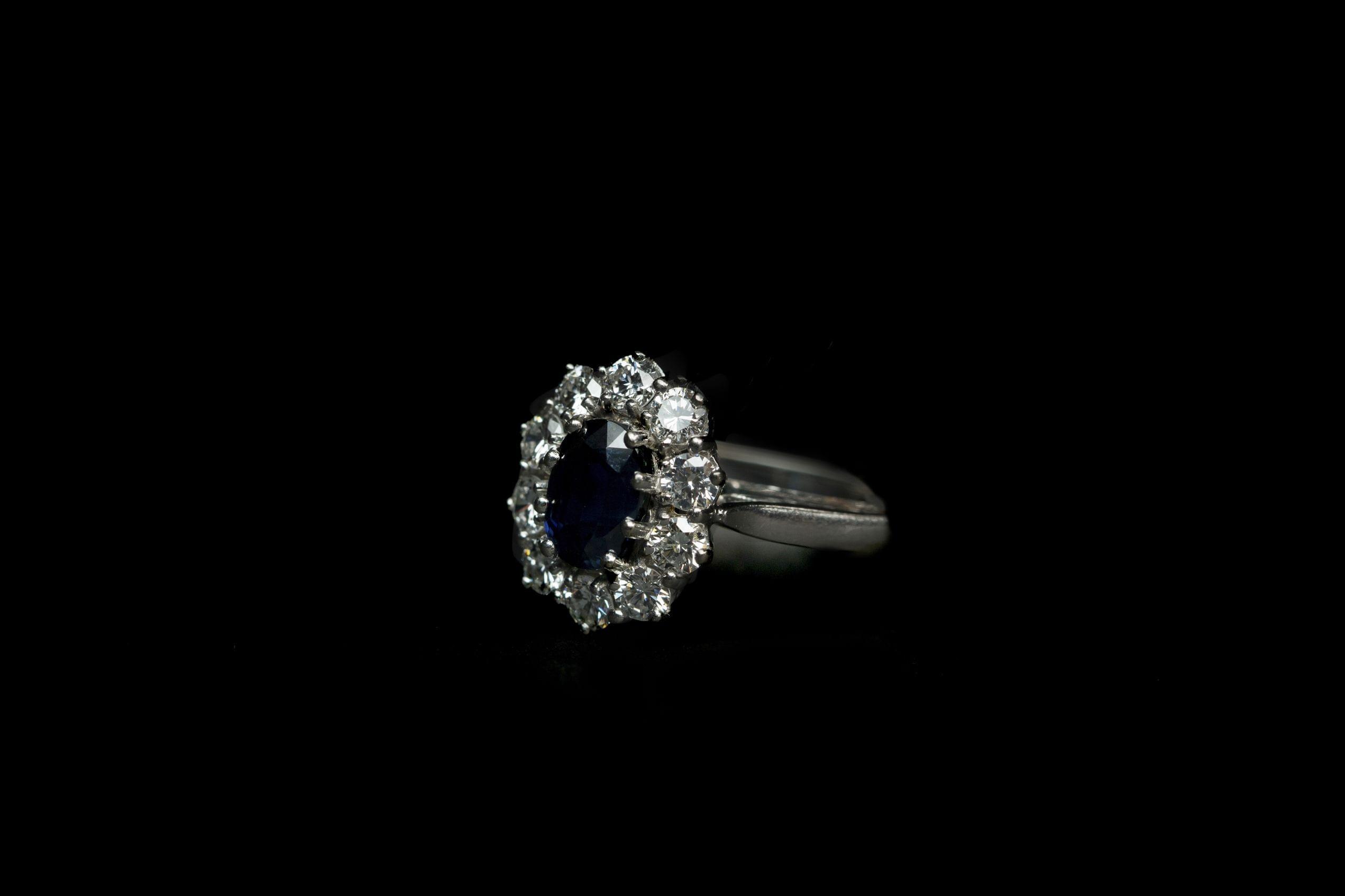 835. Bague marguerite sertie d'un saphir (env. 1 ct) entouré de diamants (env. 0,7 ct)