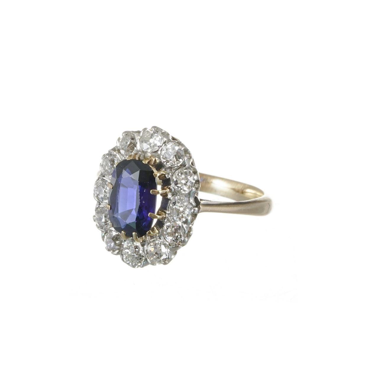 3215. Bague marguerite sertie d'un saphir ovale prob. synthétique (env. 0,9 ct) entouré de diamants taille ancienne