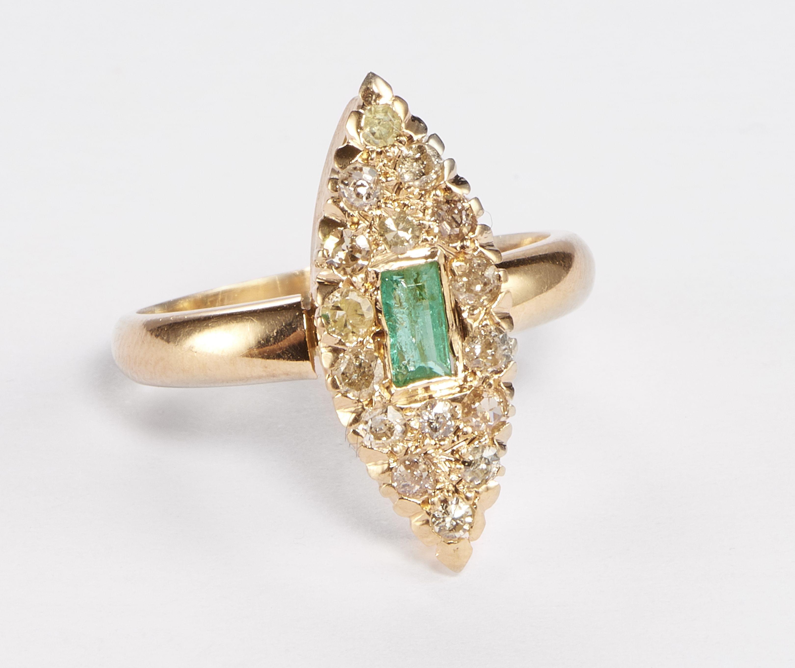 3126. Bague marquise centrée d'une émeraude taille émeraude entourée de diamants (env. 0,3 ct)