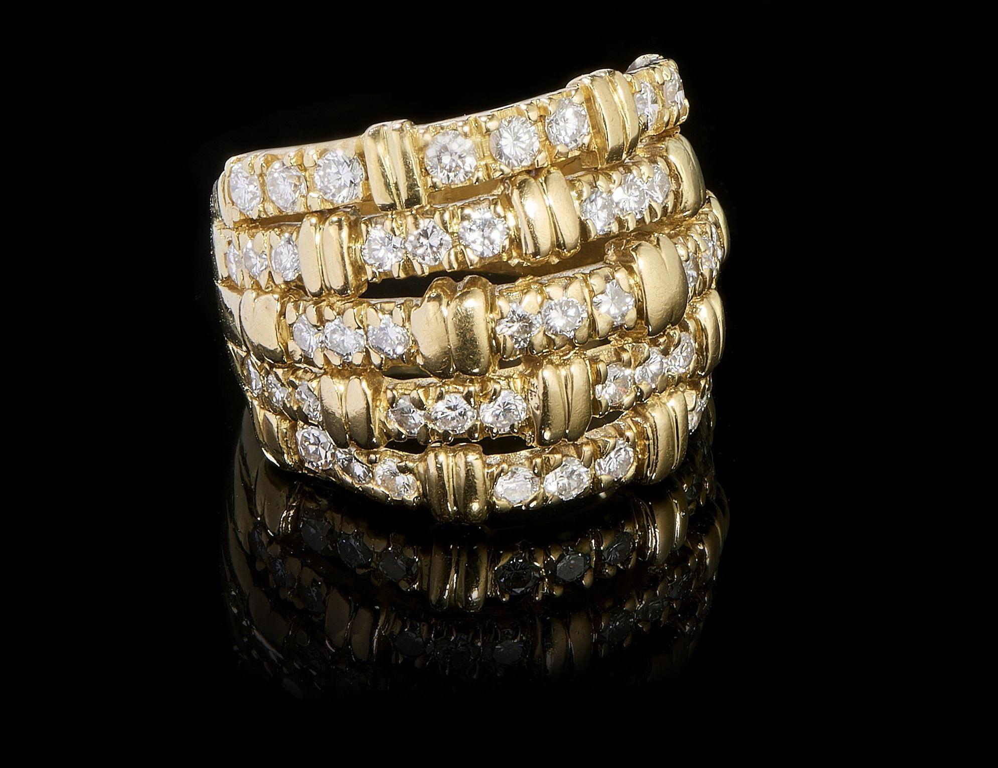 973. Bague multi-rangs sertie de diamants (env. 0,8 ct) alternés de motifs godronnés