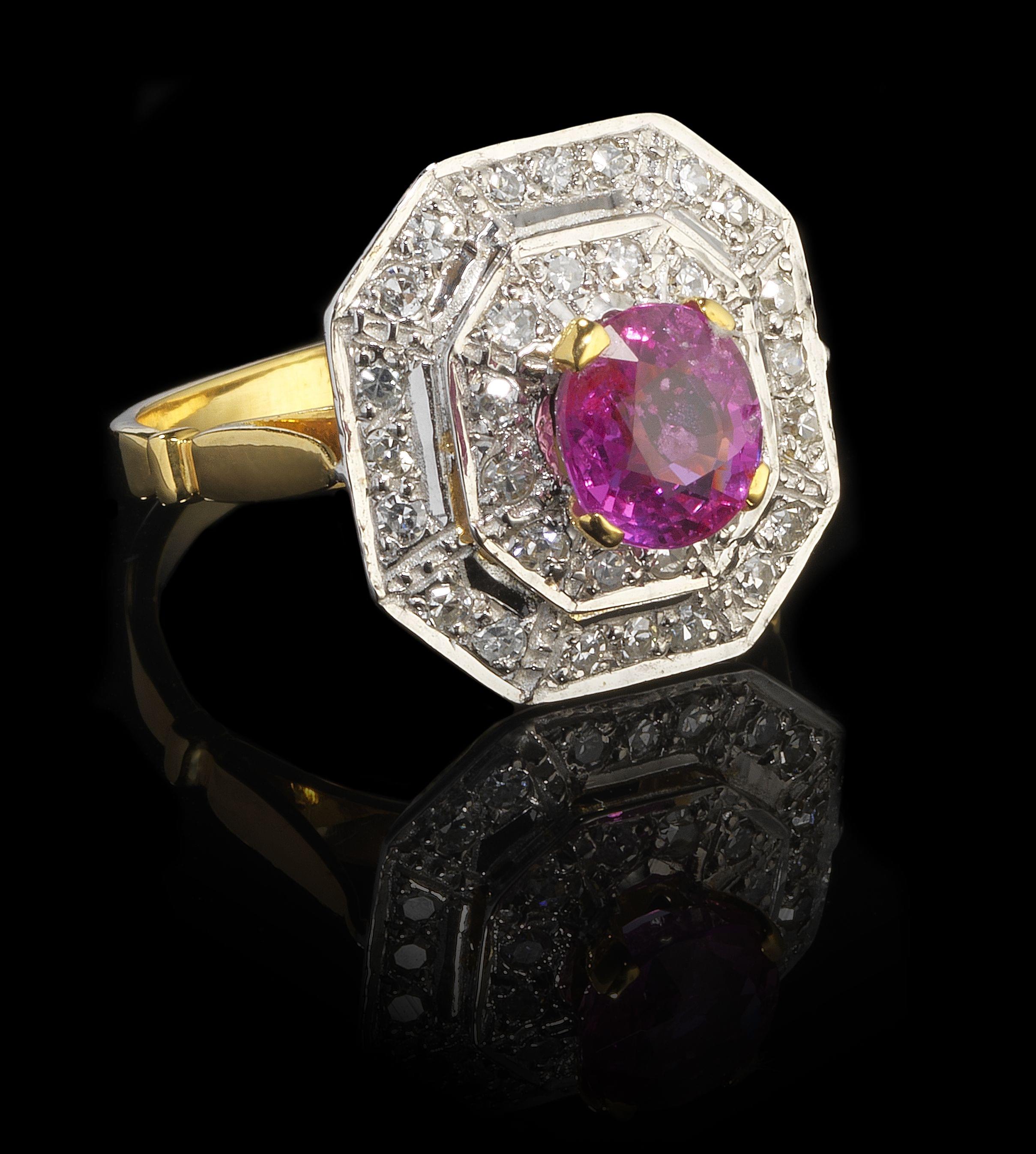 3490. *Bague octogonale sertie d'un saphir rose birman non chauffé taille ovale (1,37 ct) dans un pavage de diamants