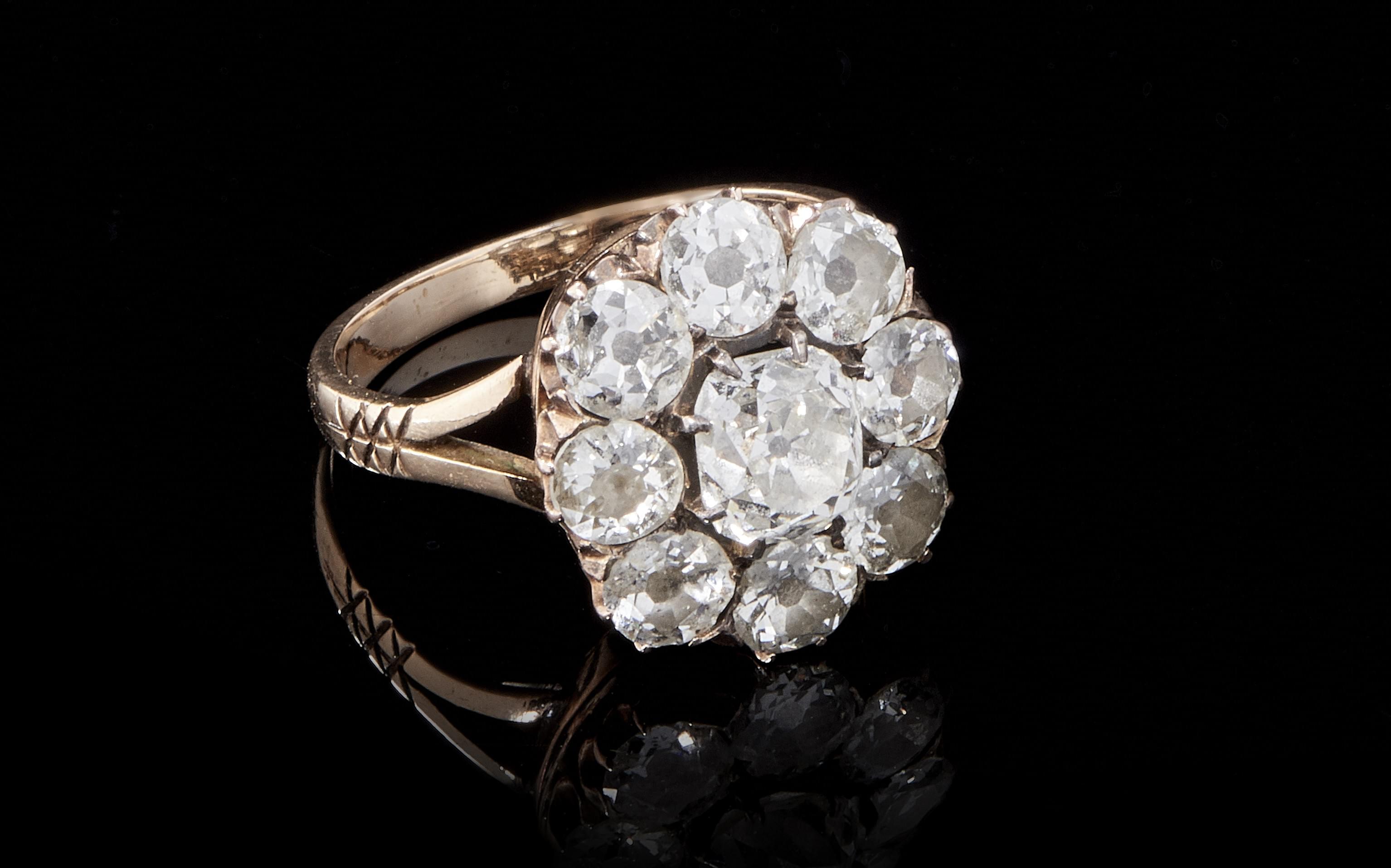 600. Bague ornée d'un motif serti d'un diamant taille ancienne (env. 0,9 ct) entouré de diamants taille ancienne (total env. 1,6 ct)