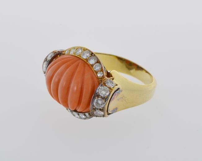 55. Bague ornée en son centre d'un cabochon de corail godronné dans un entourage de diamants