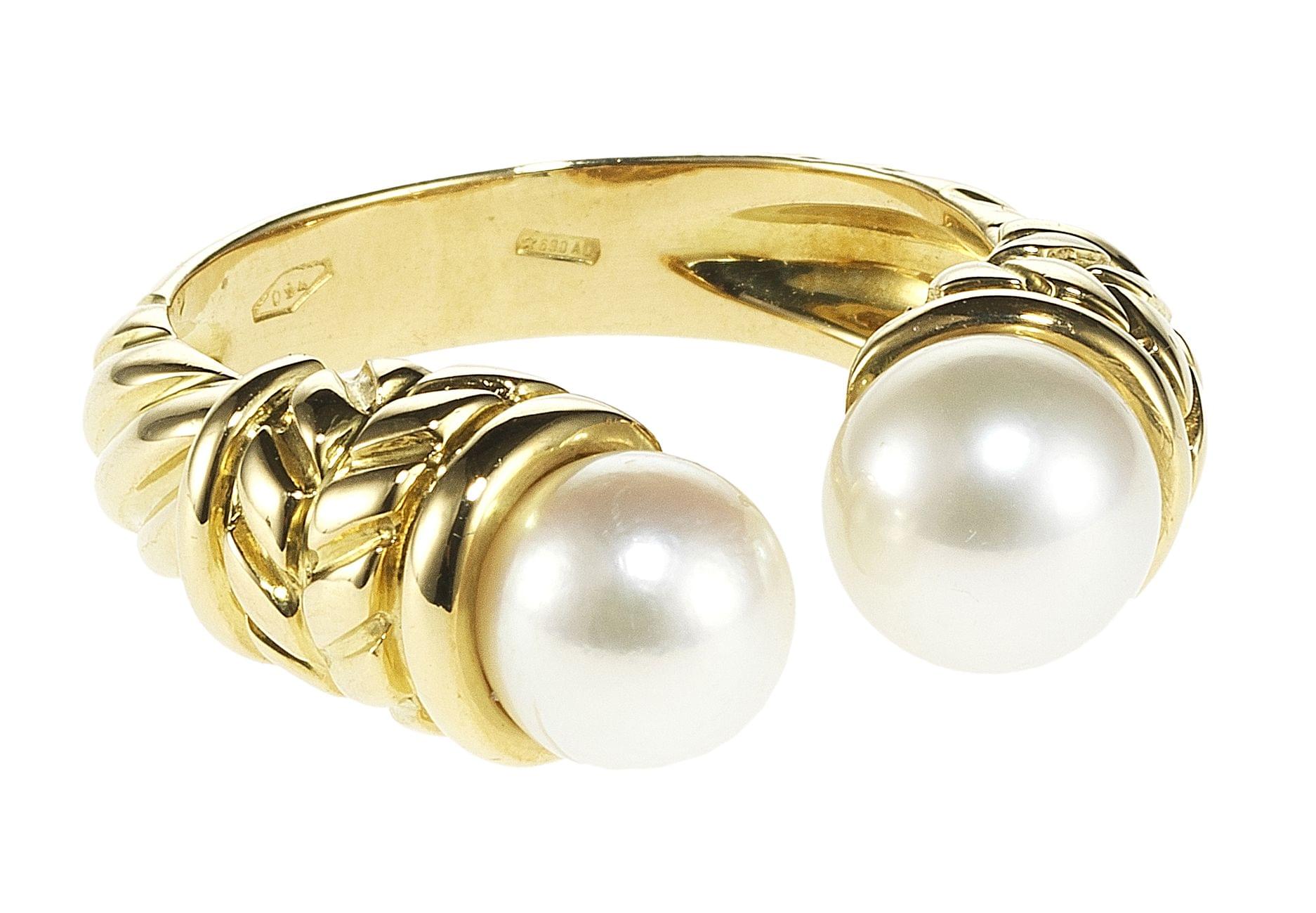 3234. Bague ouverte sertie de deux perles blanches (D env. 7 mm)