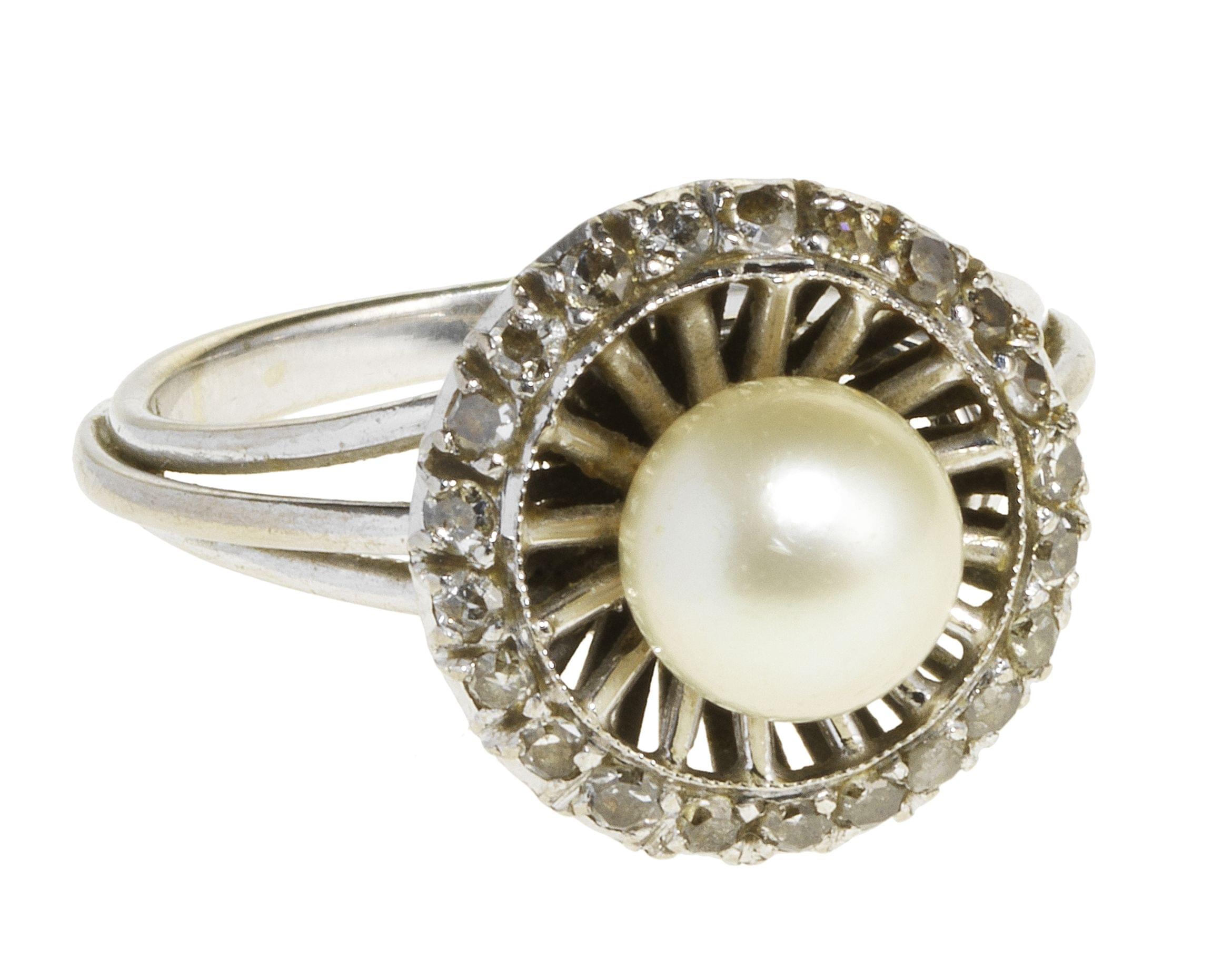 3302. *Bague ronde centrée d'une perle (D env. 6,5 mm) entourée de diamants taille ancienne sur plateau ajouré