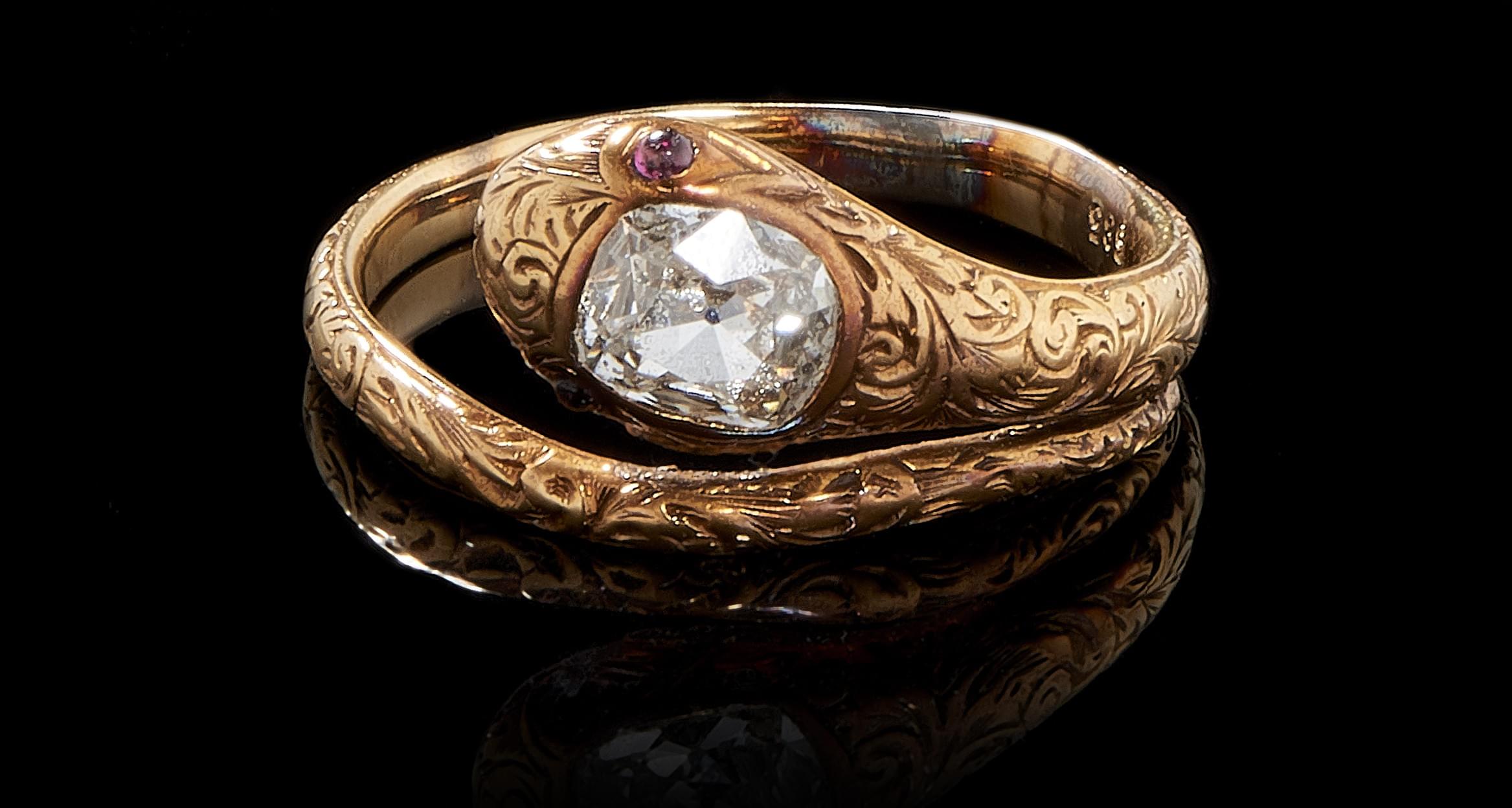 966. Bague serpent sertie d'un diamant taille ovale ancienne (env. 0,5 ct)