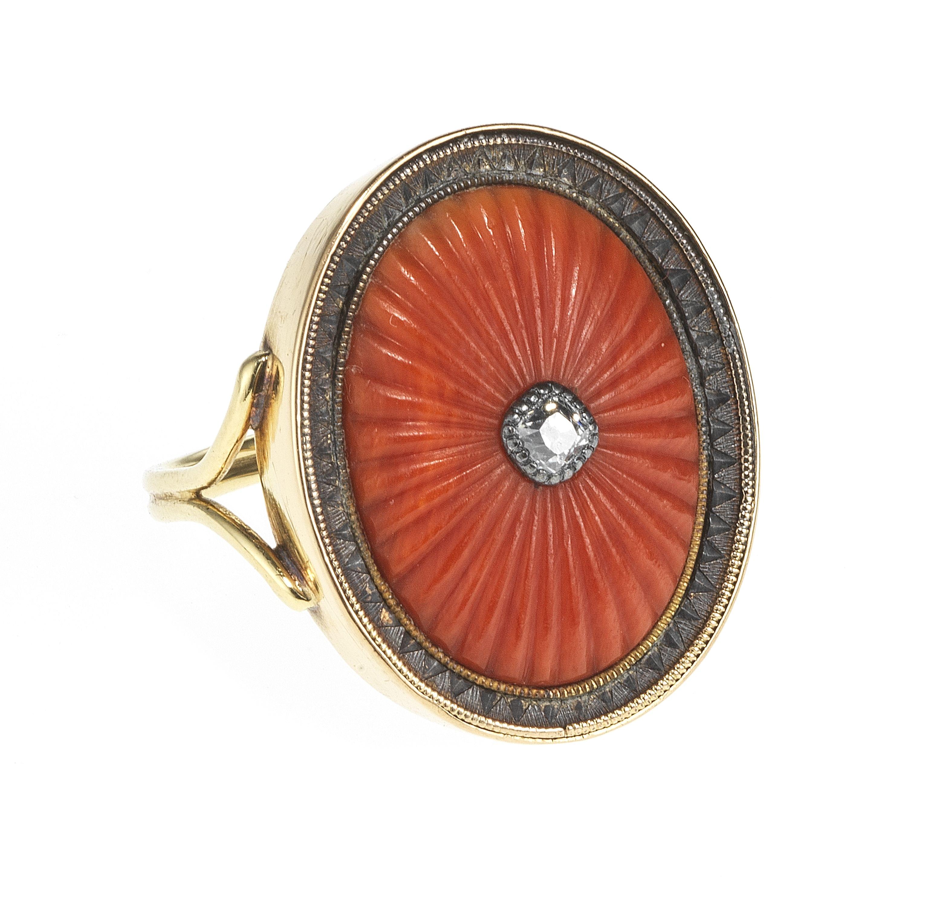 3149. Bague sertie d'un corail godronné centré d'un diamant taille ancienne
