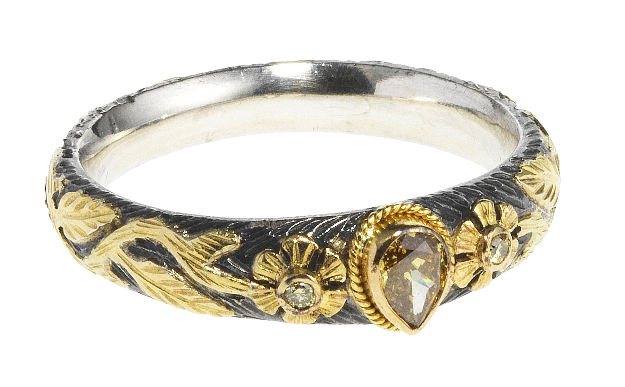 3048. *Bague sertie d'un diamant champagne taille poire (0,20 ct) épaulé de deux petits diamants