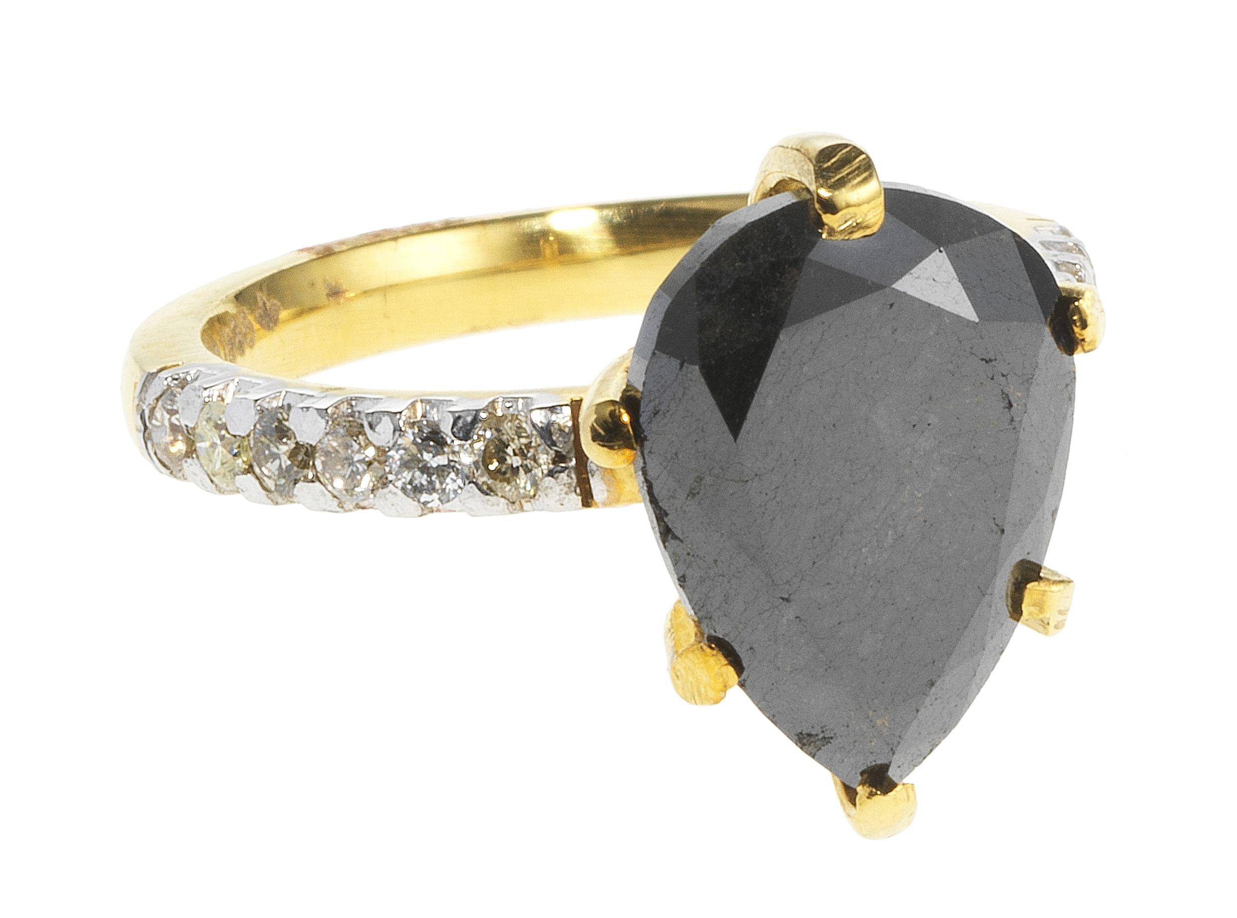 3370. *Bague sertie d'un diamant noir taille poire (5,56 ct) épaulé de diamants