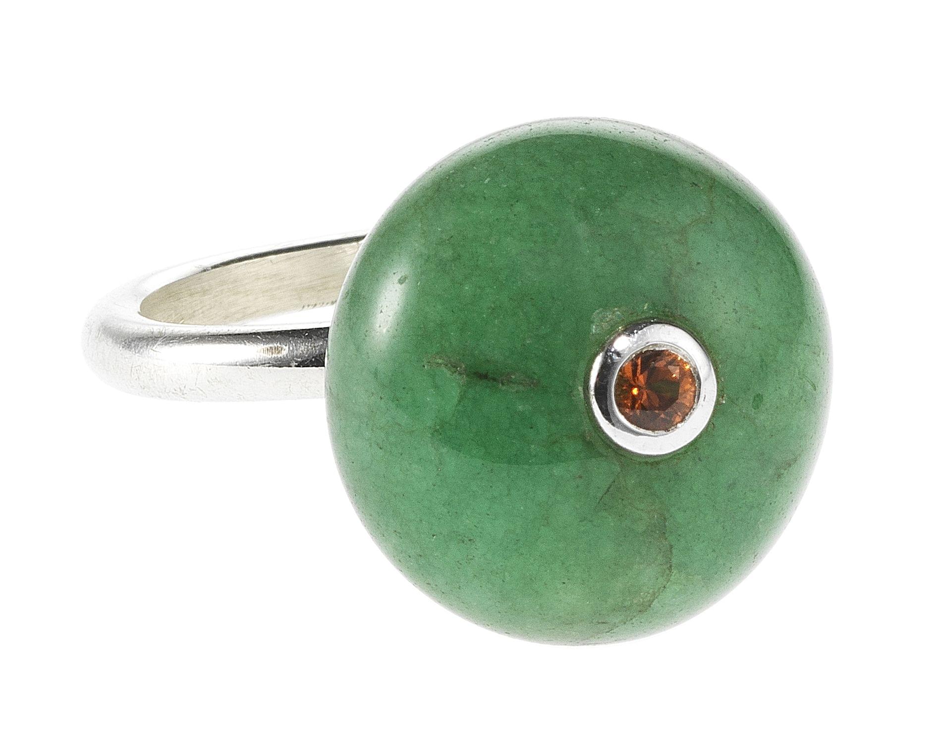 3208. Bague sertie d'un disque d'émeraude centré d'un petit saphir orange