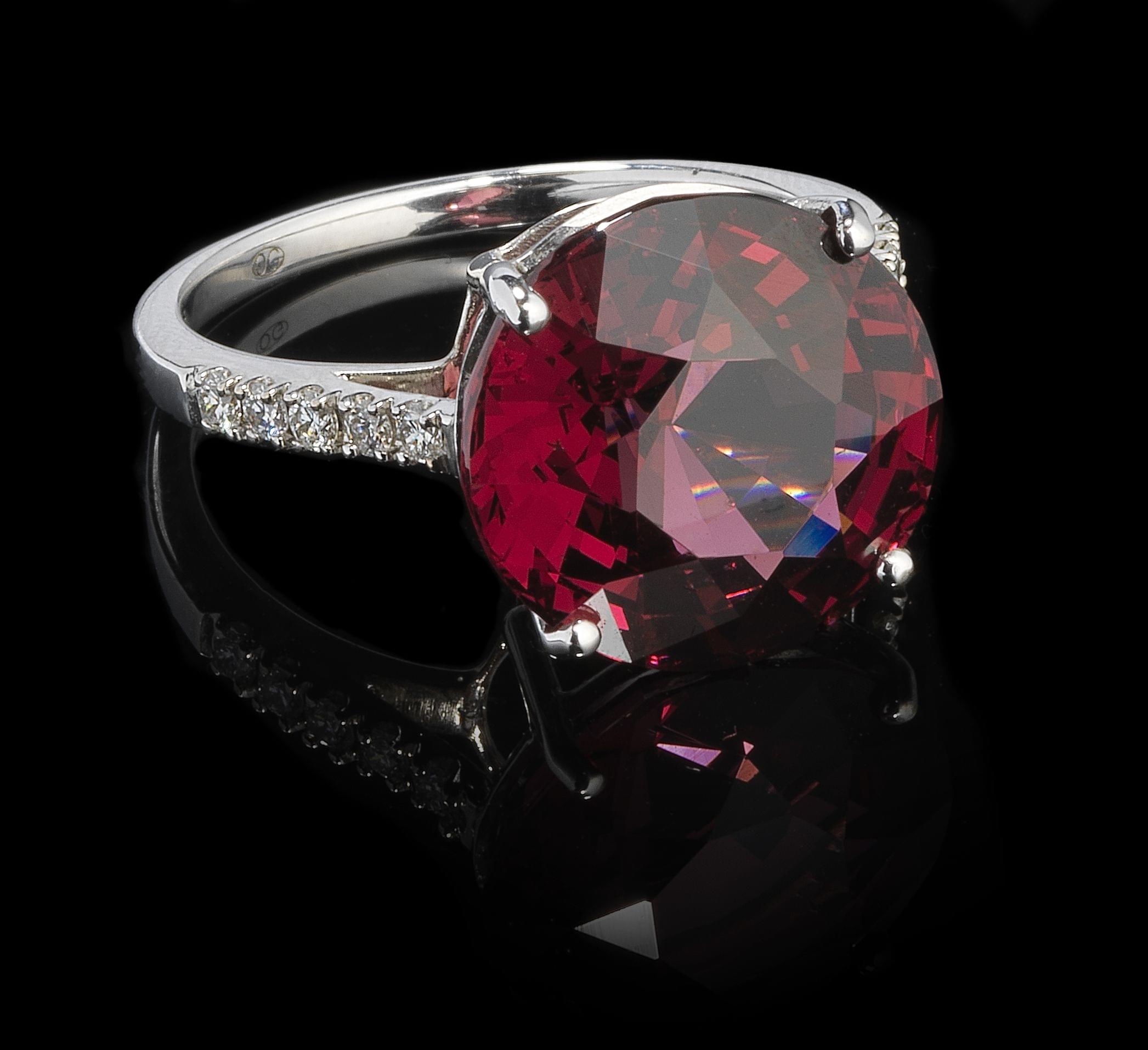 3408. Bague sertie d'un grenat pyrope non chauffé (10,8 ct) épaulé de part et d'autre d'une ligne de diamants