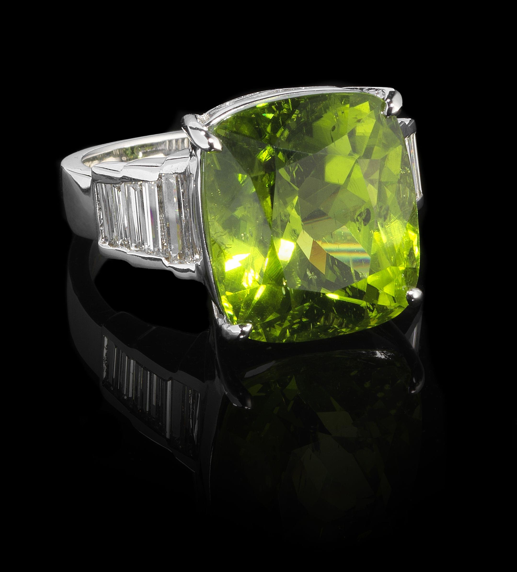 155. *Bague sertie d'un péridot birman non chauffé taille coussin (14,71 ct) épaulé de diamants taille baguette (total 0,43 ct)