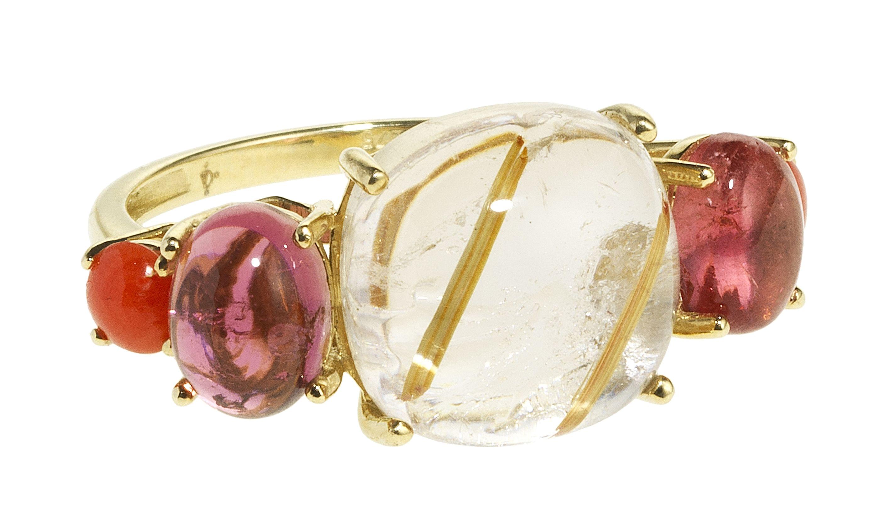 3049. *Bague sertie d'un quartz à rutile épaulé de deux tourmalines roses taille cabochon ovale et de deux boutons de corail