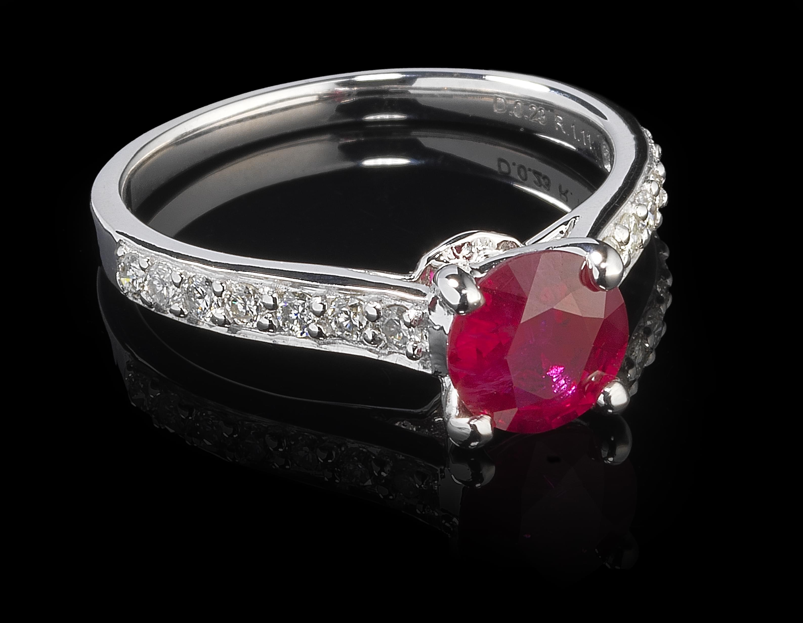 3211. Bague sertie d'un rubis taille brillant (1,11 ct) sur une monture pavée de diamants (0,23 ct)