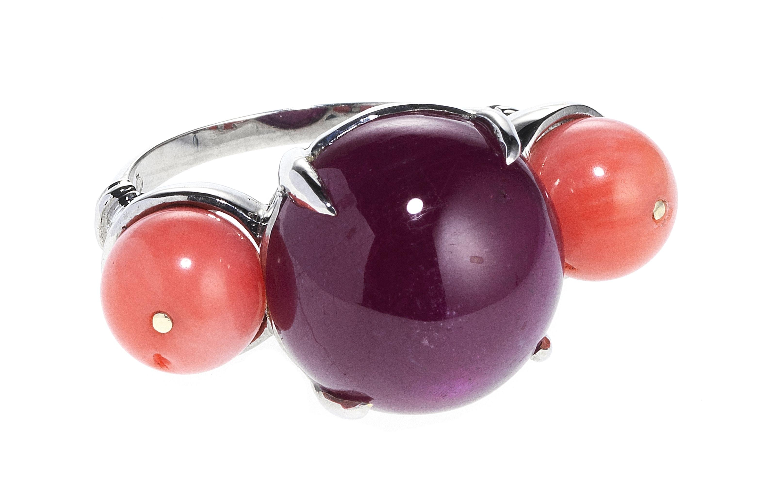 3182. *Bague sertie d'un rubis taille cabochon (env. 16 ct) épaulée de deux perles de corail sur une monture sertie de deux petits diamants