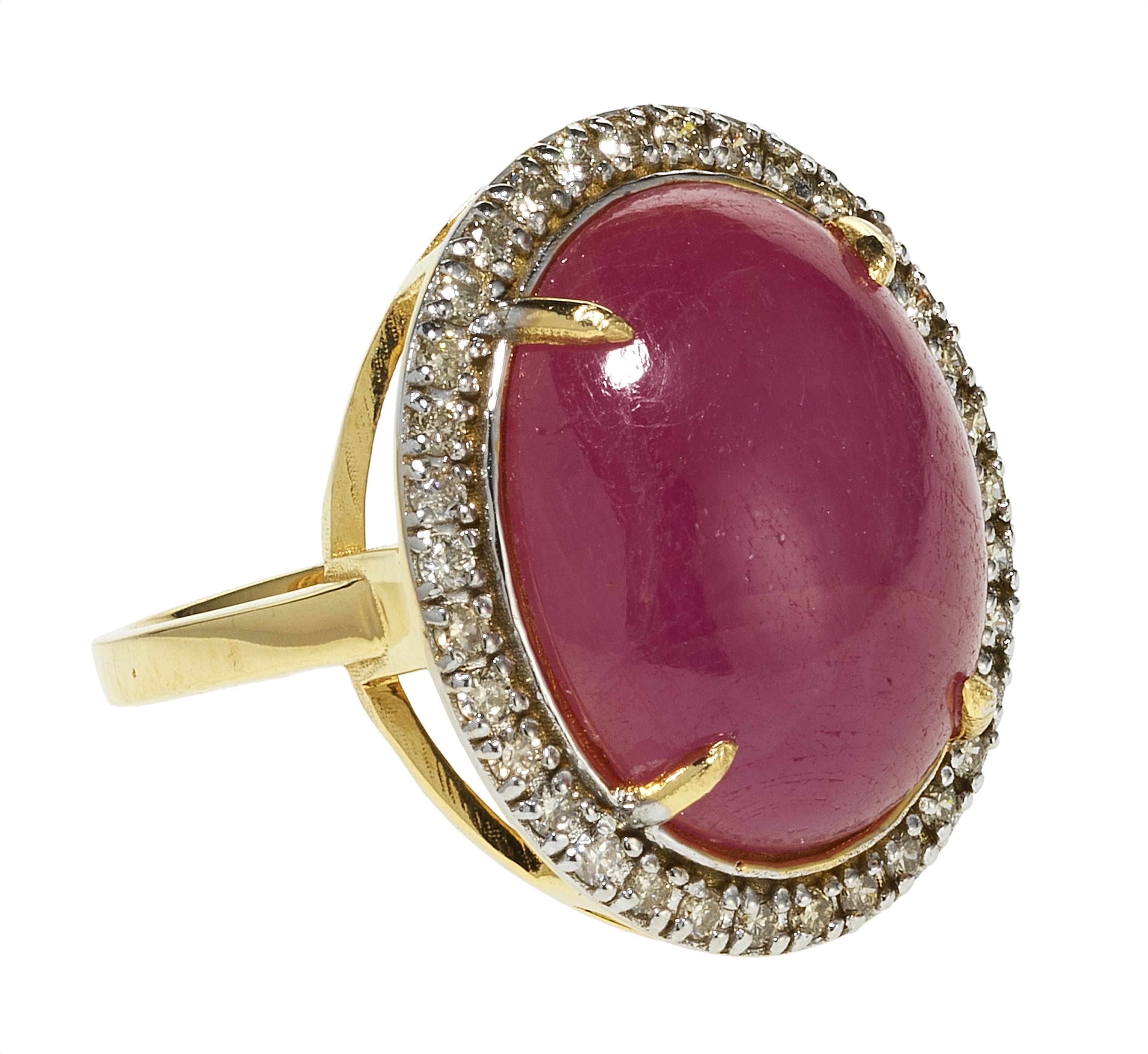 3151. *Bague sertie d'un rubis taille cabochon ovale (14,35 ct) entouré de diamants (0,36 ct)