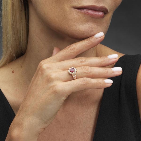 106. Bague sertie d'un rubis taille ovale (env. 1 ct) entouré de diamants et épaulé de diamants taille baguette (total env. 0,9 ct)