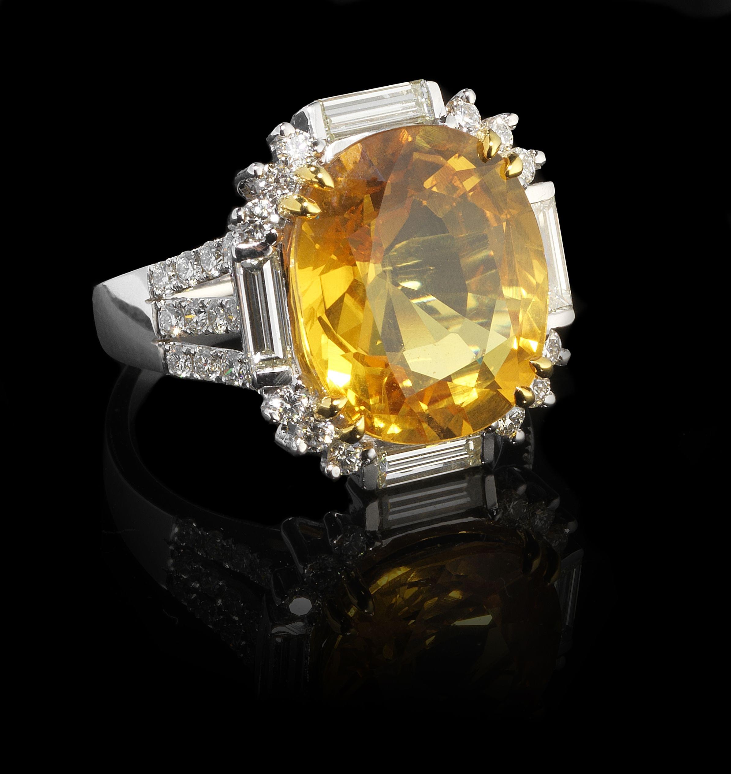 157. *Bague sertie d'un saphir jaune du Siam taille ovale (10,07 ct) entouré de diamants taille baguette et brillant (1,16 ct)