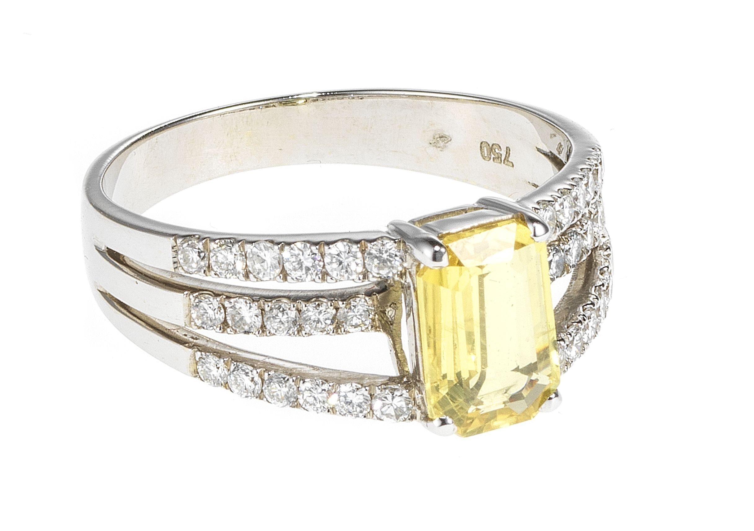 3426. *Bague sertie d'un saphir jaune taille émeraude (env. 1 ct) épaulé de trois lignes de diamants