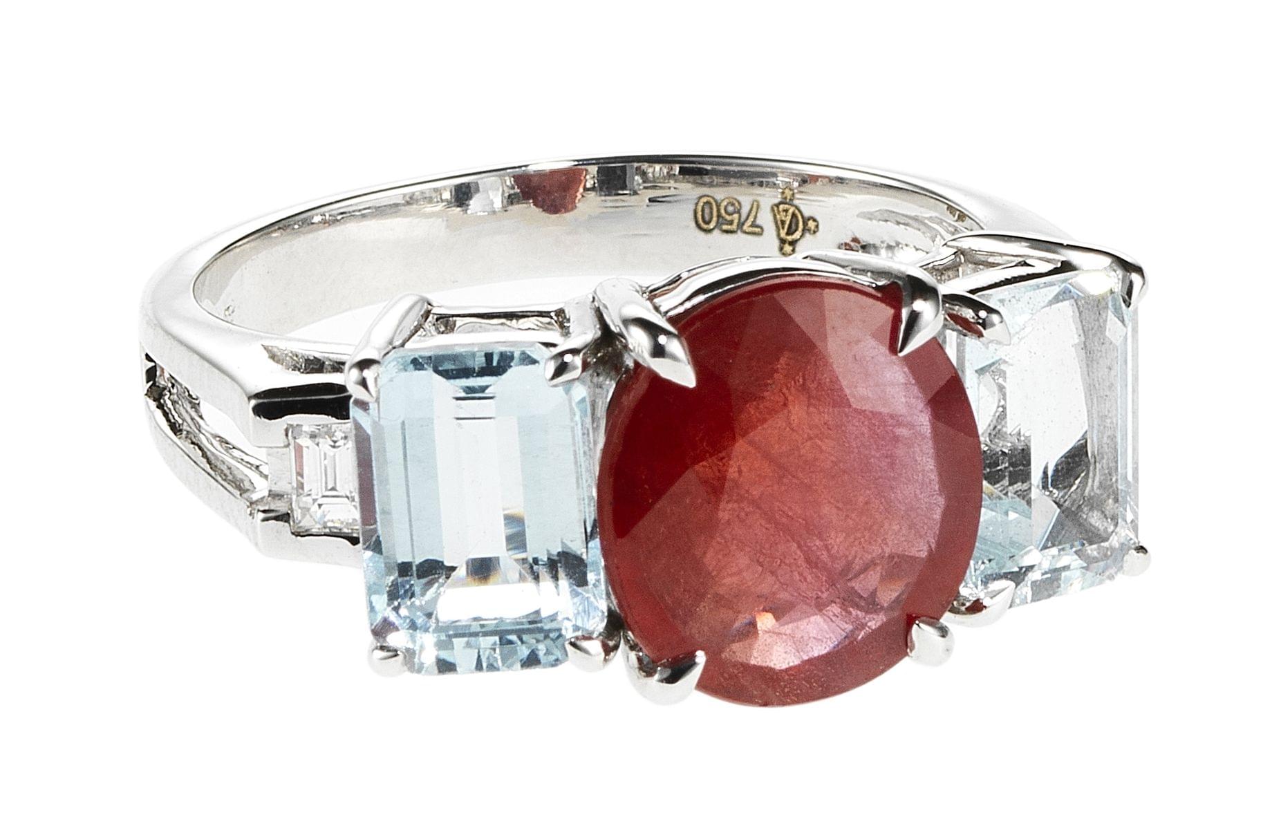 3248. *Bague sertie d'un saphir orange taille ovale (env. 2,5 ct) épaulé de deux aigues-marines (env. 1,8 ct) et de diamants
