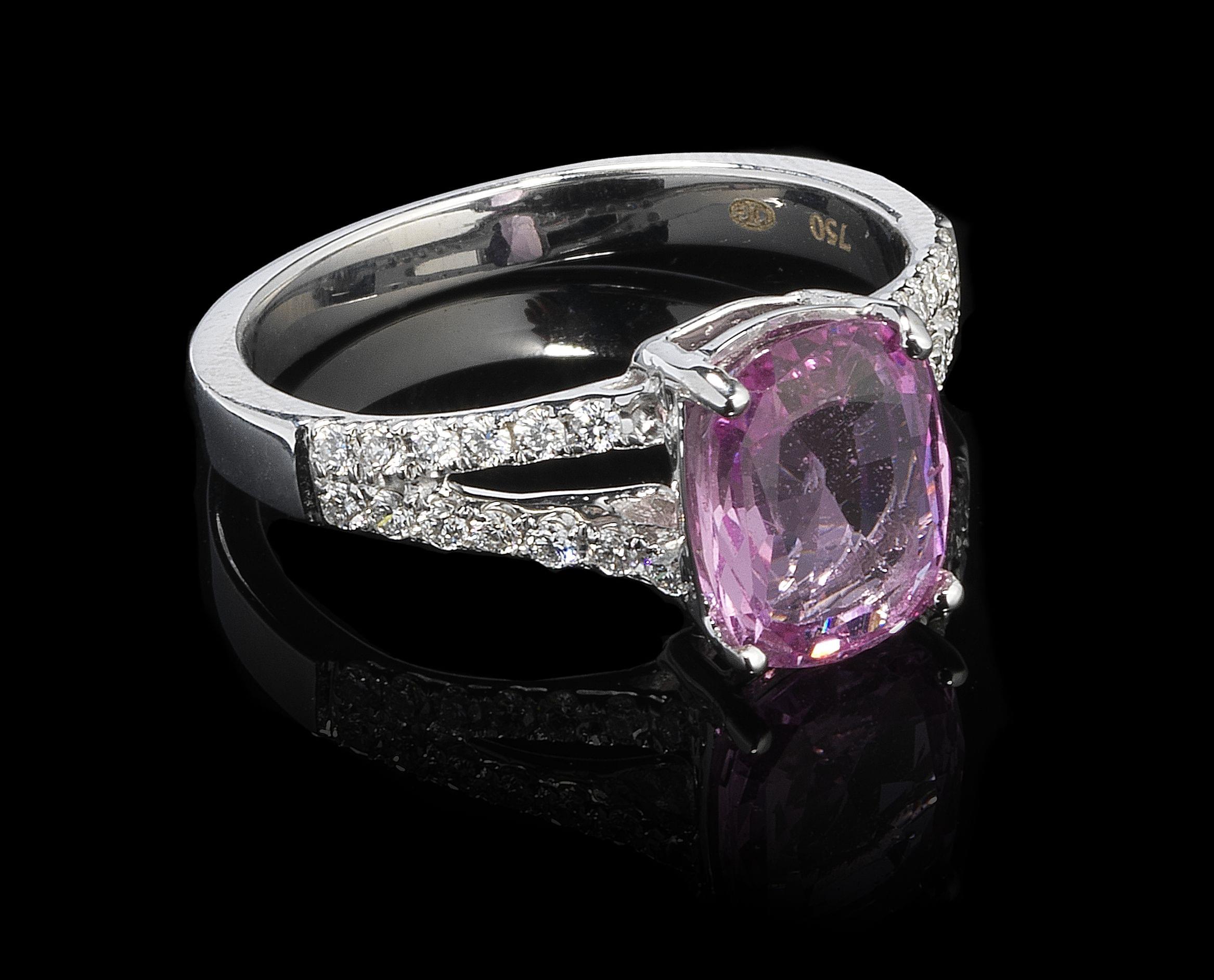 73. Bague sertie d'un saphir rose de Madagascar, non chauffé, taille coussin ovale (2,26 ct) épaulé de deux lignes de diamants