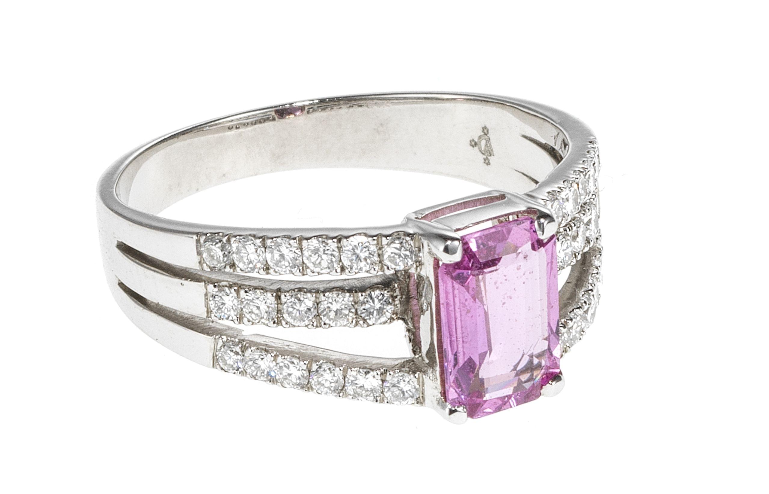 3425. *Bague sertie d'un saphir rose taille émeraude (env. 0,8 ct) épaulé de trois lignes de diamants