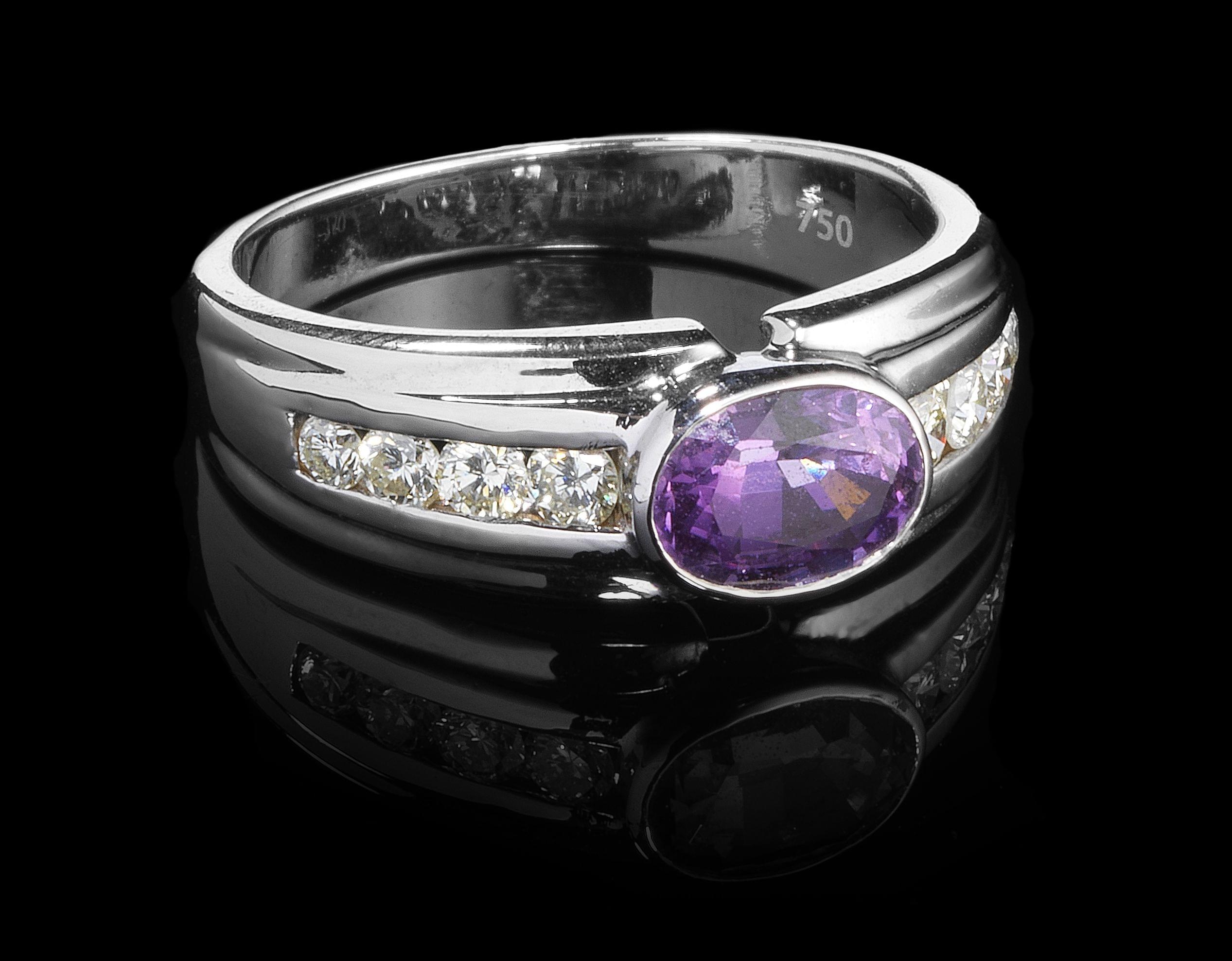 3395. *Bague sertie d'un saphir rose taille ovale (1,38 ct) épaulé de lignes de diamants