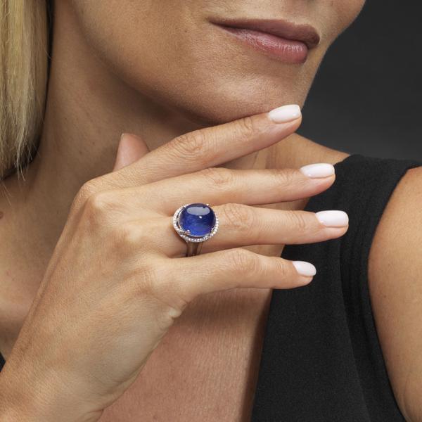3492. *Bague sertie d'un saphir taille cabochon (env. 20 ct) entouré de diamants (env. 20 ct)