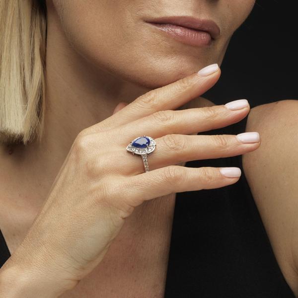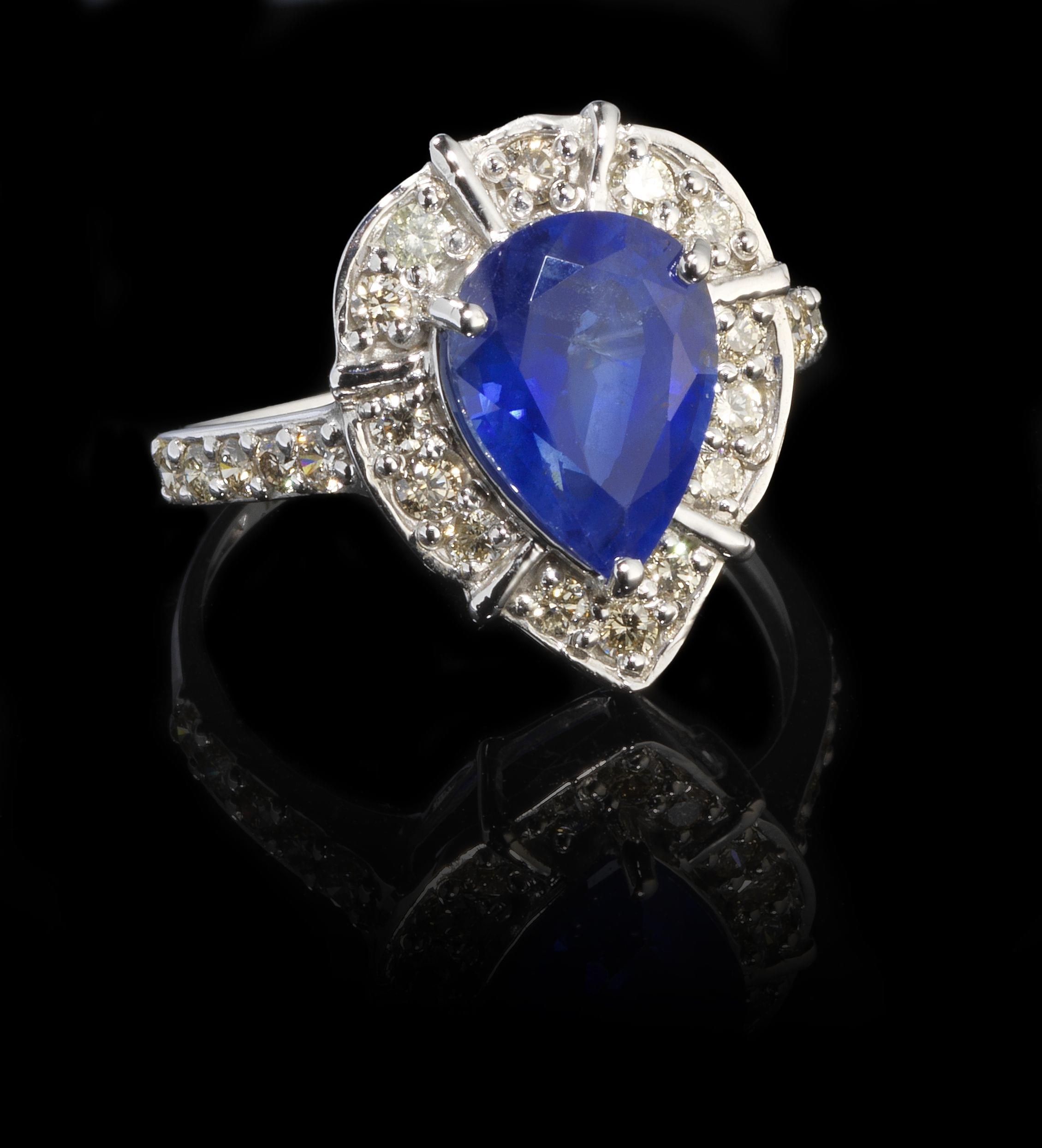 174. Bague sertie d'un saphir taille poire (2,83 ct) entouré et épaulé de diamants (total 0,87 ct)