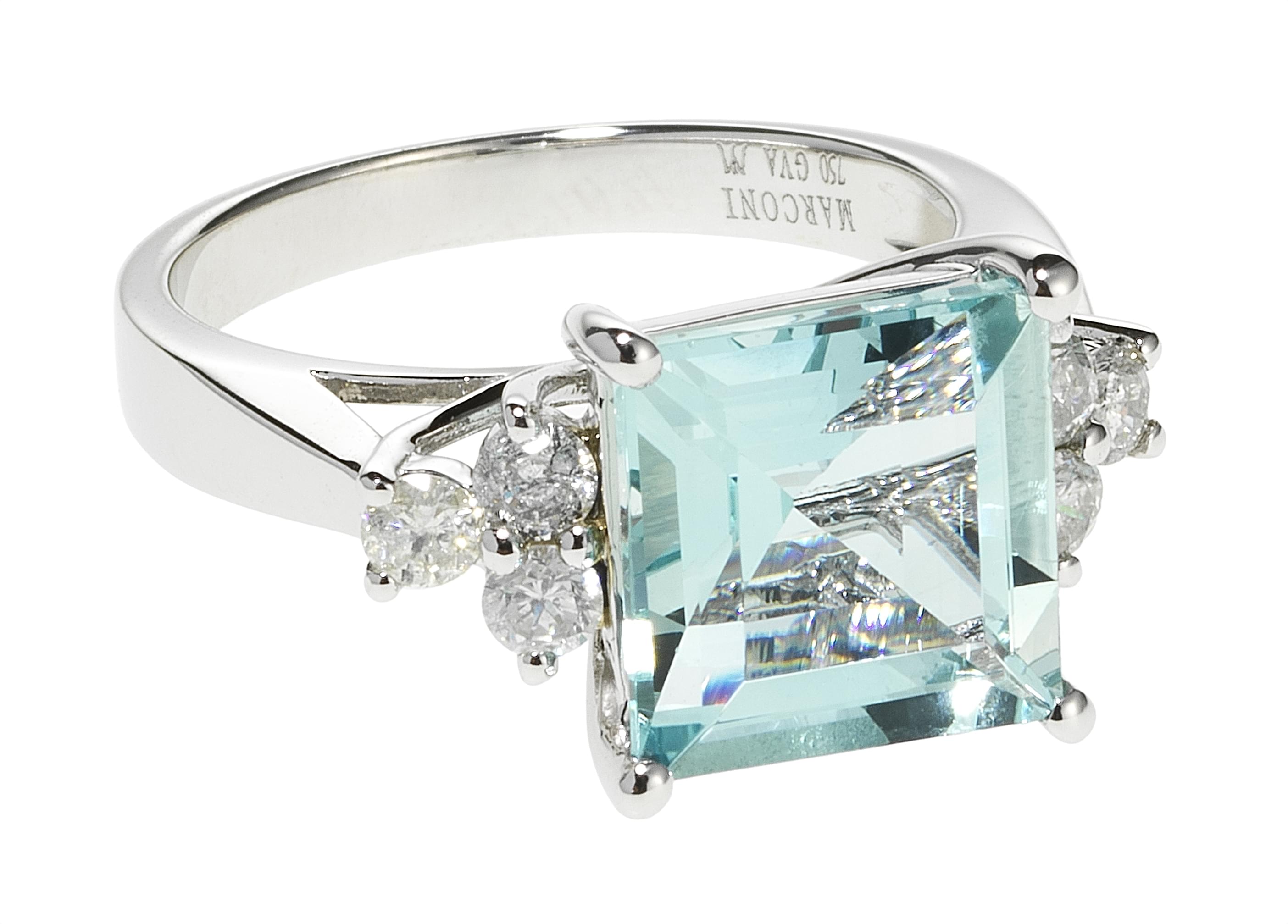 3311. Bague sertie d'une aigue-marine taille carrée (env. 3,1 ct) épaulée de diamants (env. 0,35 ct)