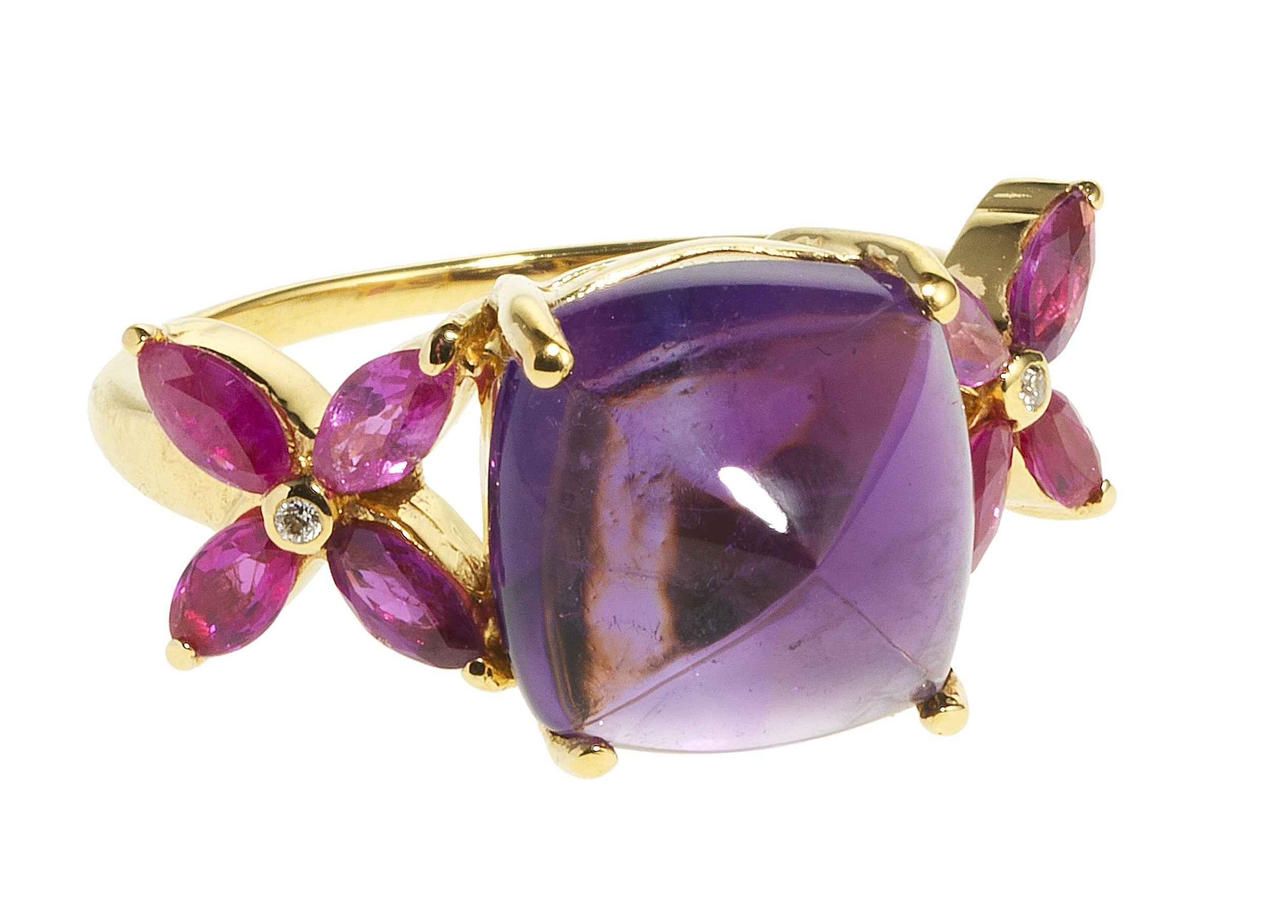 3241. *Bague sertie d'une améthyste en pain de sucre (env. 3,5 ct) épaulé de deux fleurs serties de rubis et diamants