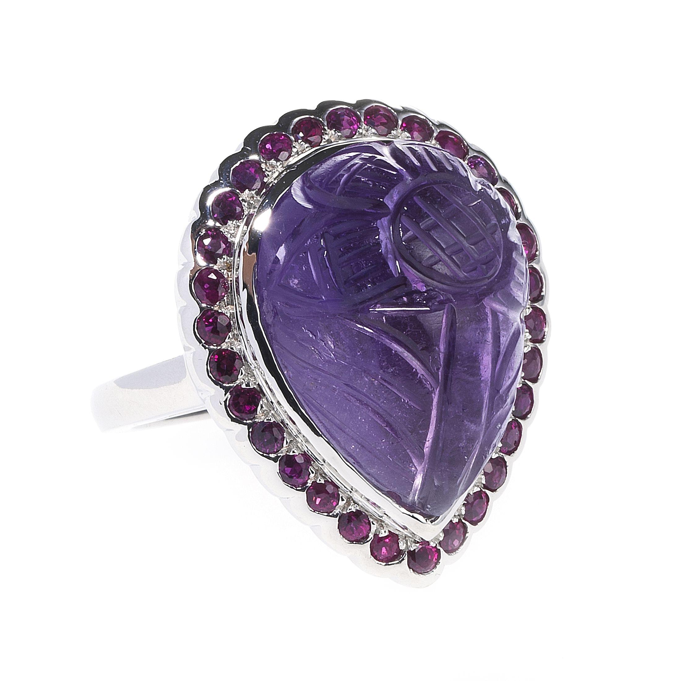 3364. Bague sertie d'une améthyste taille cabochon poire gravée à motif floral entourée de rubis