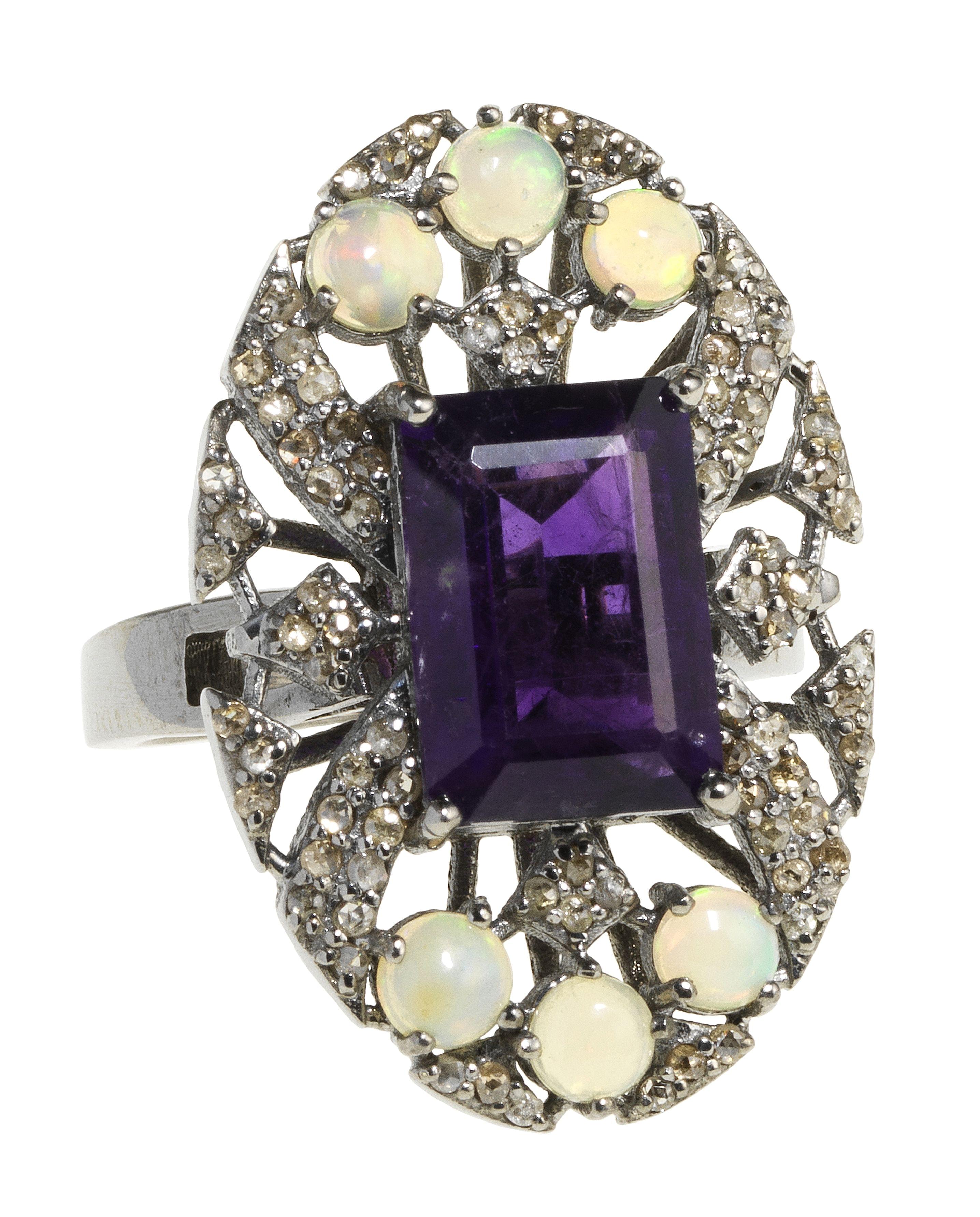 3166. *Bague sertie d'une améthyste taille émeraude sur une monture ajourée pavée d'opales et de roses de diamant