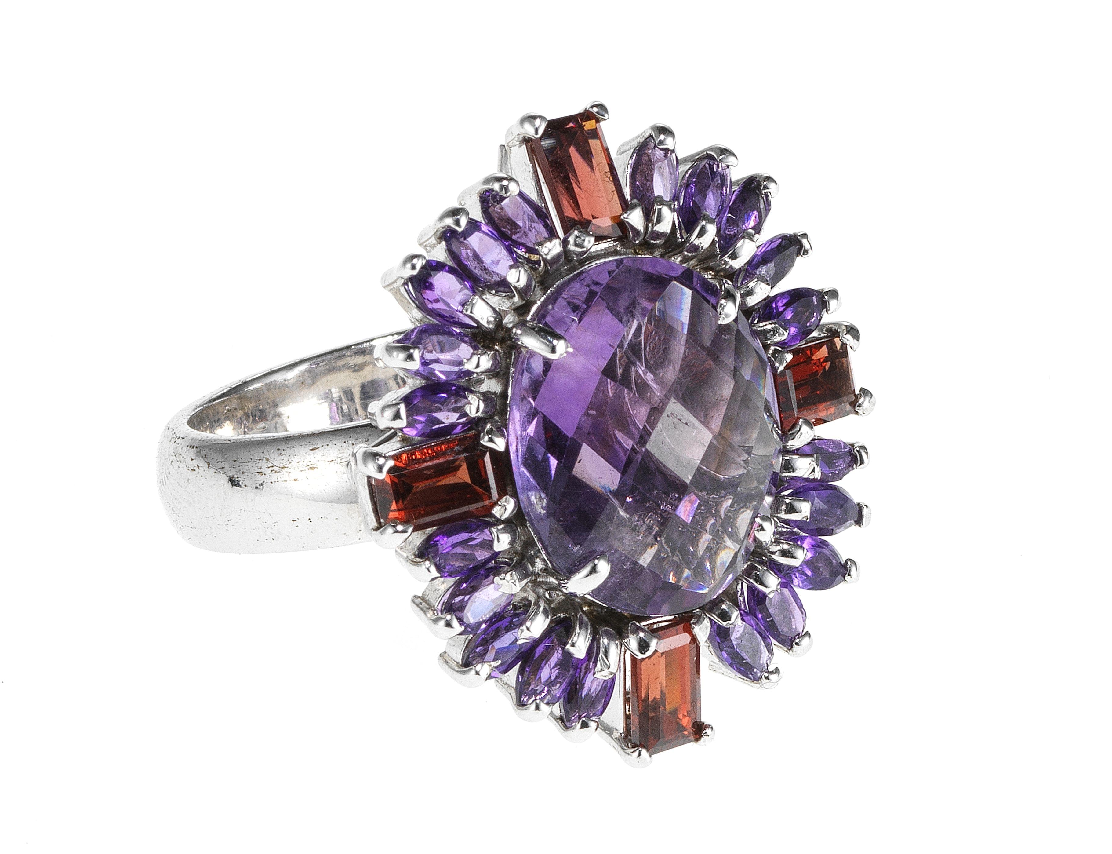 3121. Bague sertie d'une améthyste taille ovale facettée entourée de grenat taille rectangle et d'améthystes taille navette