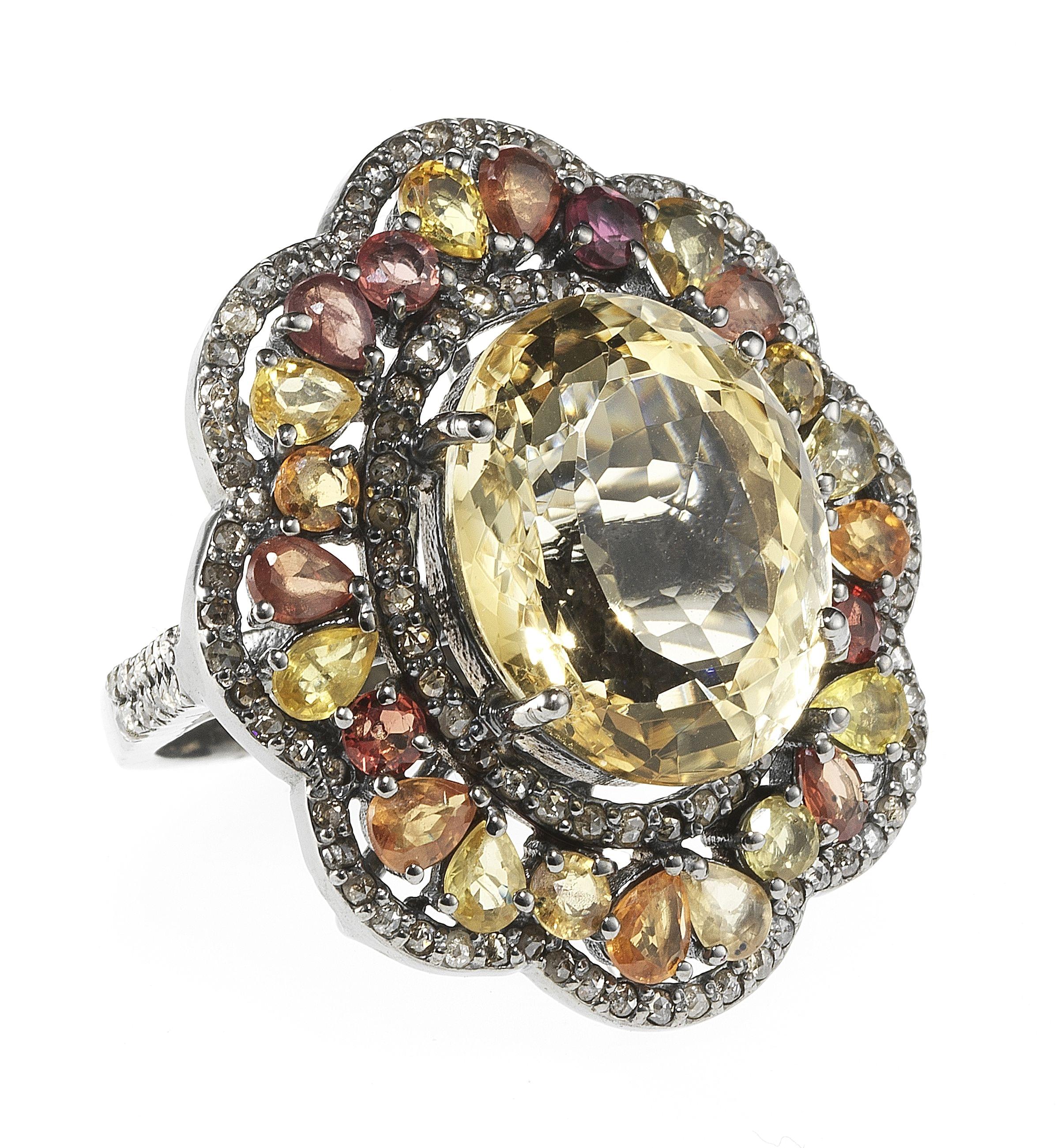 Entourée de diamants taille rose et de saphirs de couleurs dans les tons jaunes-orangés, argent noirci, doigt 57-17. Pour les lots précédés d'un *, la TVA de 7,7% est due sur l'entier du prix d'adjudication.