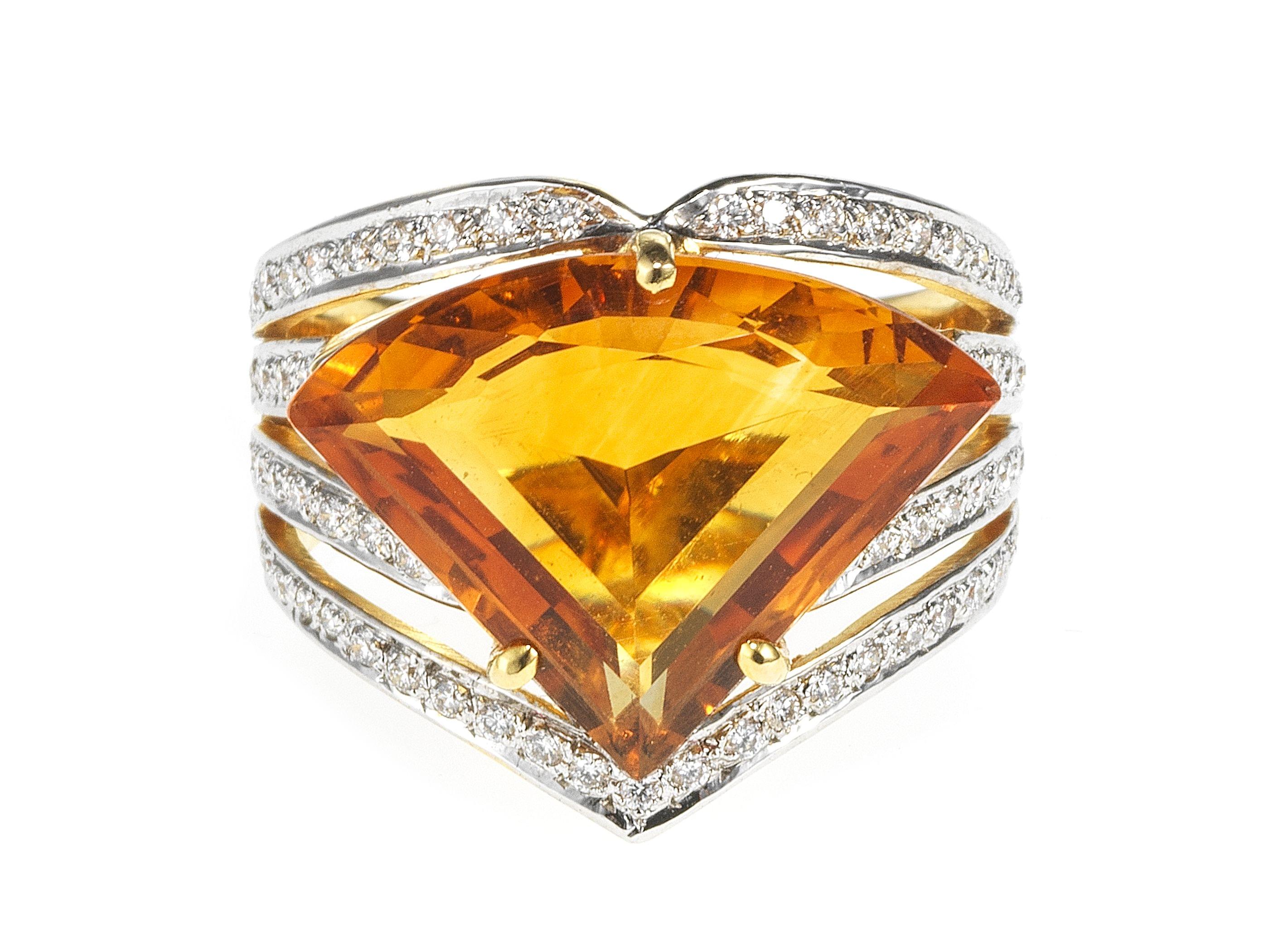 3389. *Bague sertie d'une citrine taille triangulaire fantaisie épaulée de lignes de diamants