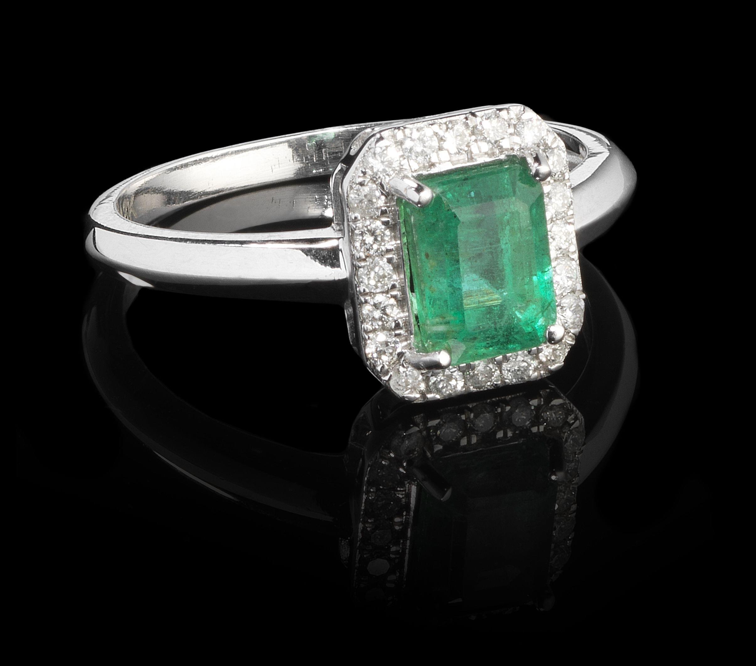 3460. *Bague sertie d'une émeraude de Zambie taille émeraude, minor oil, (1,4 ct), entourée de diamants